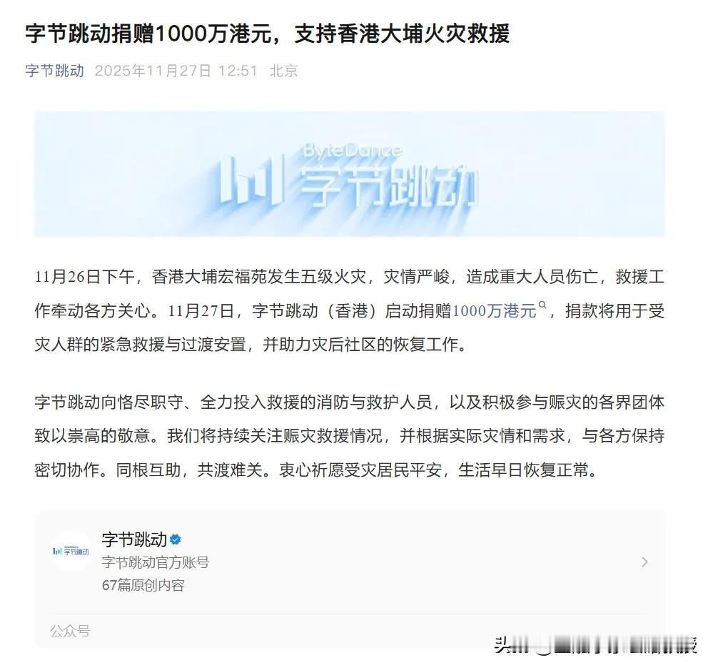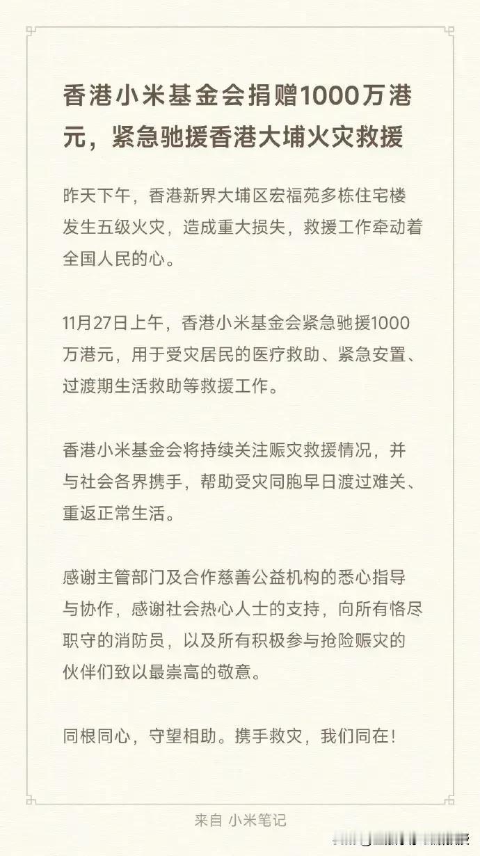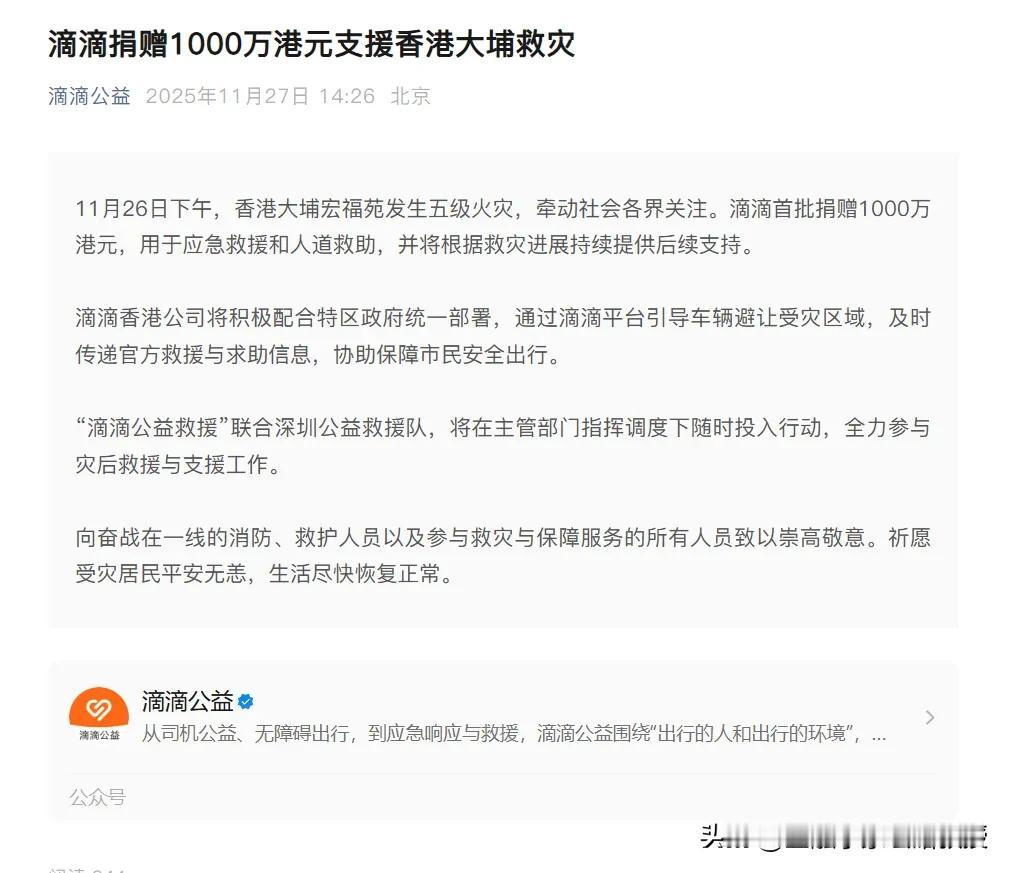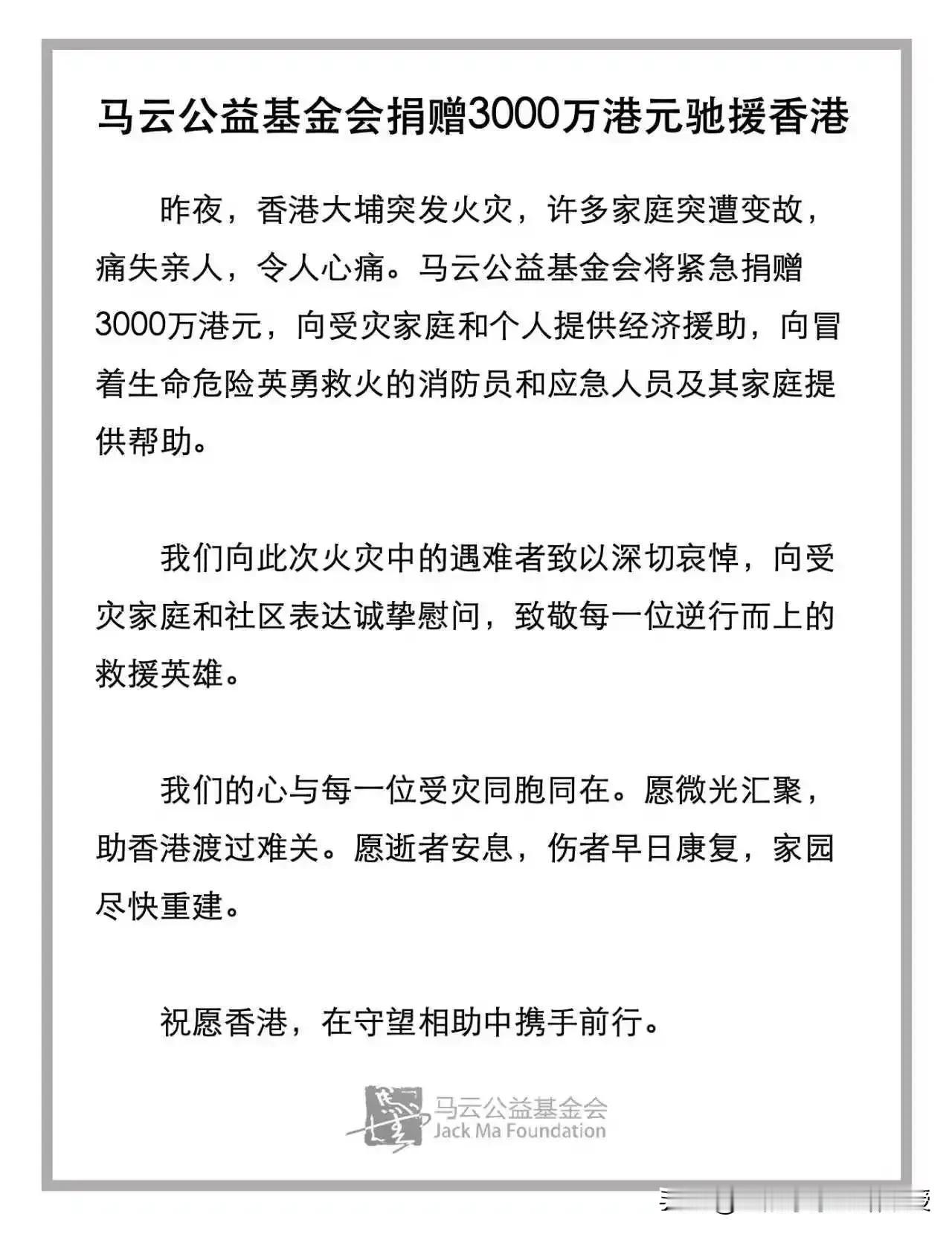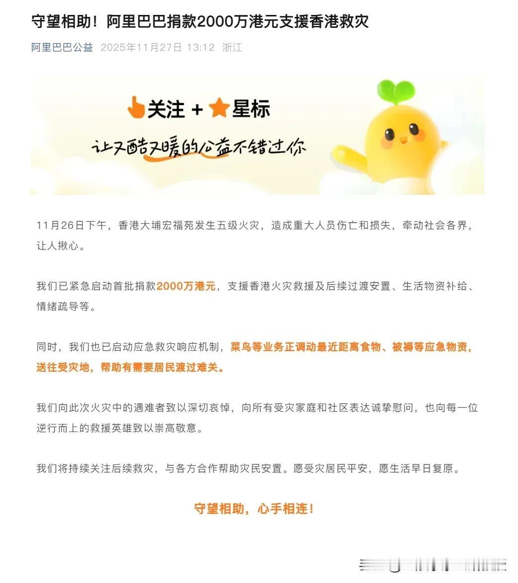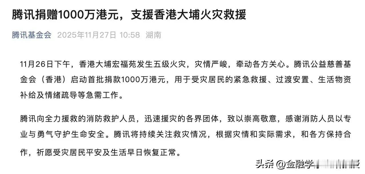 香港的大楼发生火灾,内地企业赈灾救灾的速度确实是第一! 刘强东不久前收购的佳宝超市,当天就把救援物资配送到现场,今天又通过京东物流第一时间从香港1号仓调配生活物资继续援助香港。另外,安踏也是及时行动,捐了3000万元现金及物资。腾讯,滴滴,字节,小米也各捐了1000万元,361°捐了1500万港币,阿里系共捐款6000万元,还有中国红十字会也捐款200万人民币。 这么多内地企业在第一时间迅速援助香港,说明祖国永远是香港最坚实的后盾,同胞同心,便没有跨不过的难关!这便是“一国两制”下的团结伟力!