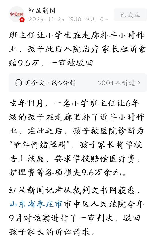 山东枣庄,六年级学生没有完成作业,老师没打没骂,叫他到走廊去补,半个小时左右回到了教室。没多久,老师发现这名学生状态不对,赶紧打电话叫他母亲接回看病,母亲说自己忙,老师便安排两名学生将他护送回家。事后,家长带孩子检查,确诊为“童年情绪障碍”,家长一口咬定,怪老师让他娃补作业,体罚他娃留下了严重的心理阴影,要求学校赔偿9.6万余元。学校很委屈:补作业是合理管教行为,且老师全程无体罚,为什么赔钱呢?孩子家长也不管,一怒之下将学校和老师告上法庭。 六年级这个学生,按说也不小了,作业没写完,老师让他去走廊补一补:这操作,放在以前,简直温柔得不能再温柔。 多少人小时候没写作业,被老师批评甚至“竹板伺候”,都觉得理所当然。可现在,老师不打不骂,只让你到走廊写作业,已经算是“佛系”管理。 结果半小时后,孩子回教室状态不太对劲,老师敏锐地发现了不对,第一时间打电话给家长。可家长说自己忙,没空接娃,老师无奈又让两名学生护送孩子回家。 后面家长带孩子医院一查,说是“童年情绪障碍”,把锅全甩到老师头上,开口就索赔近10万,还把学校告上法庭。 老师一腔好心,最后反倒成了“被告席”的常客。难怪学校觉得委屈,老师们更是心里拔凉拔凉的。 其实,老师让学生补作业,本来就是最基本的教学管理。你作业没完成,让你补一补,这难道不应该?要是啥事都不能说、不能管,老师还怎么带班? 更何况,这次老师没动手没动嘴,态度还很平和,最后孩子状态不对,老师还第一时间联系家长。这操作,搁谁看,都是负责任的表现。 可到了家长那边,剧情却急转直下。家长一口咬定,孩子的心理问题就是老师“让他走廊补作业”造成的,甚至把这事描述成“体罚”升级版。 说白了,就是把孩子出问题的责任,全推给了学校和老师。这几年,老师的日子其实越来越难过。如今的家长,个个都希望孩子被当成“宝贝蛋”呵护着。 遇到点小事就找学校、找老师、找媒体。老师们一边要教书育人,一边还得提心吊胆,生怕一个不小心被家长“举报”。有的老师甚至自嘲:“现在不是教书,是走钢丝。” 而家长这边,其实也有自己的苦衷。社会压力大,职场节奏快,孩子稍微有点不顺,家长就如临大敌,恨不得把所有麻烦都推给学校。 再加上现在“心理健康”这根弦被拉得很紧,医院一纸诊断,家长立马感觉“有理有据”,于是换来的是一场场维权大战。 其实,老师的压力和家长的焦虑,全都堆到了一起。最后,最受伤的还是孩子。老师怕管,家长怕出事,孩子成长的空间越来越窄。 曾经的“严师出高徒”,如今变成了“老师不能碰,不能说,不能管”。最让人唏嘘的,是这场风波里“补作业”竟然被家长定义成了“体罚”。 一说体罚,大家想到的是打骂、羞辱;可现在,连让孩子去走廊补作业都能“上纲上线”,那以后老师还怎么管理班级?难道要对没写作业的学生视而不见,任由大家“躺平”? 有网友说得好:“老师要是啥都不敢管,那还不如直接改行卖早点算了。”其实,这也是很多老师的心声。现在做老师,成了一份“高危职业”。 一边是家长的高期待,一边是社会的高要求,老师稍有不慎就可能被推上舆论的风口浪尖。大家都说“教书育人”,可现实里,老师们越来越像“临时工”,随时可能“背锅”。 家长为孩子争取权益,本无可厚非。孩子有心理问题,家长当然要重视,也要积极寻求帮助。可问题是,心理障碍的成因极其复杂,不能一味甩锅给学校和老师。 更何况,这次事件里,老师的做法并没有任何过激之处。老师第一时间发现孩子异常,积极联系家长,最后还安排同学护送孩子回家。 这种责任心,搁谁看都是“加分项”。如果连这样的老师都要被告上法庭,那以后谁还敢带班?家长有心为孩子维权没错,但也要有基本的判断力。 什么是真正的“体罚”,什么是合理的“教育管理”,不能混为一谈。动辄就“索赔”“起诉”,其实是在给教育生态添堵。 当然,咱也得承认,现在的孩子确实更容易出现心理问题。学习压力大、家庭关系复杂、网络环境嘈杂,这些都对孩子的心理造成了影响。 真正健康的心理,不是靠别人“顺毛捋”出来的,而是在生活中一点点磨炼出来的。遇到挫折、经历失败、承受压力,这才是成长的必修课。 山东枣庄这个六年级学生的故事,说到底,是一场关于“教育边界”的大讨论。老师没有打骂,反倒被送上被告席;家长急于维权,却忽略了自己在孩子成长中的责任。 教育从来不是一帆风顺,成长也不是一路顺风。每个孩子都要经历风雨,才能见到彩虹。老师的合理管教,是一种爱护;家长的理解和陪伴,是孩子最好的“保险”。 参考资料: 《班主任让小学生在走廊补半小时作业,孩子此后入院治疗 家长起诉索赔9.6万,一审被驳回》——红星新闻
