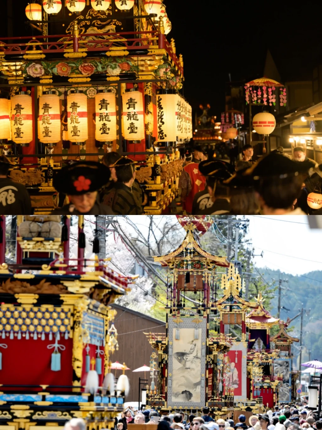 并且每年的四月还会举办高山祭,“高山祭”被联合国教科文组织列为“无形文化遗产”,是日本最具代表性的传统节日之一,祭典的主角是12台雕刻精美的彩车,白天停放在街头,供游客近距离欣赏,晚上灯笼点亮,夜幕下巡游,氛围感直接拉满!