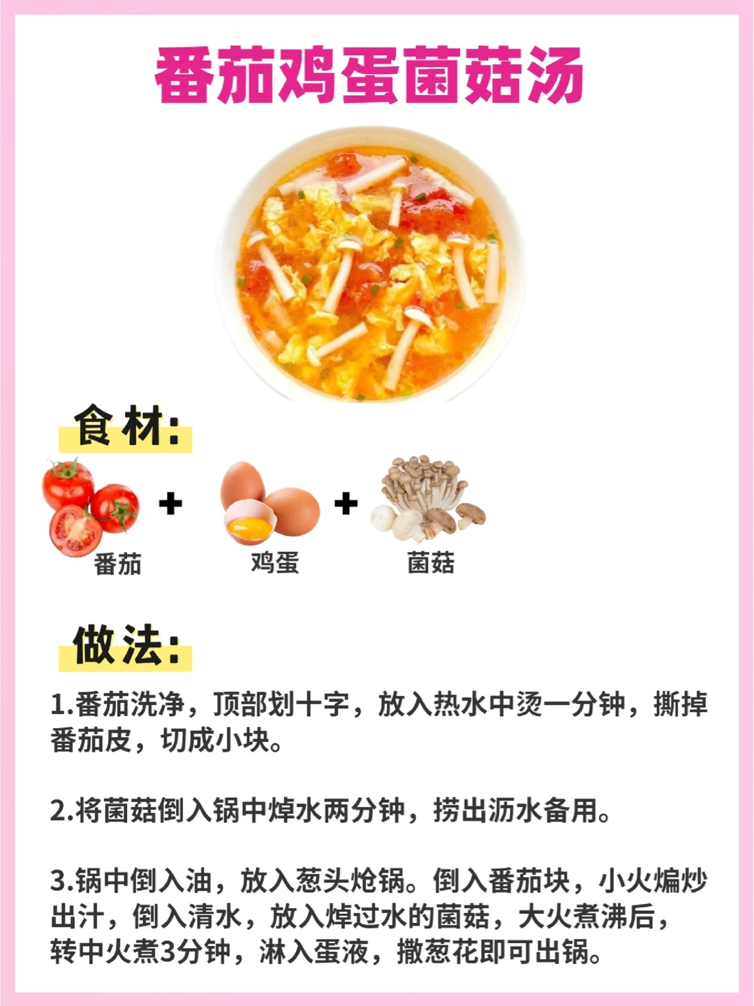 3⃣️番茄🥚蛋菌菇汤——提高食欲、肠道蠕动