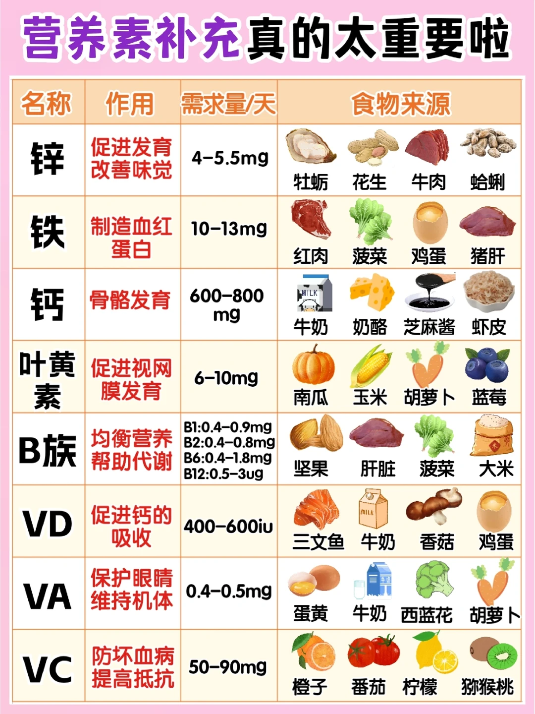 🌈维生素、矿物质对人体非常重要‼尤其是在儿童成长发育过程中,是身体素质打好基础的重要元素!如果长期缺乏某种营养,身体就会释放信号,这时就需要我们通过食物或相应的营养素来及时补充!