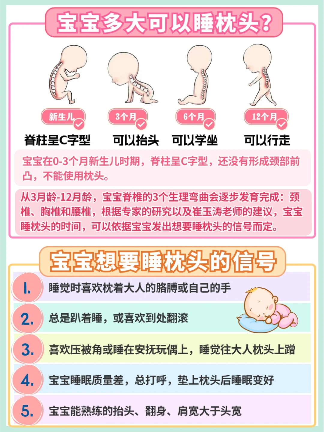 很多新手妈妈都不知道宝宝什么时候开始用枕头?用哪种枕头好?一切听婆婆的又很不放心!宝宝枕头睡的不对,不仅会影响脊柱发育,还会造成头型难看!用错枕头悔终生!😭