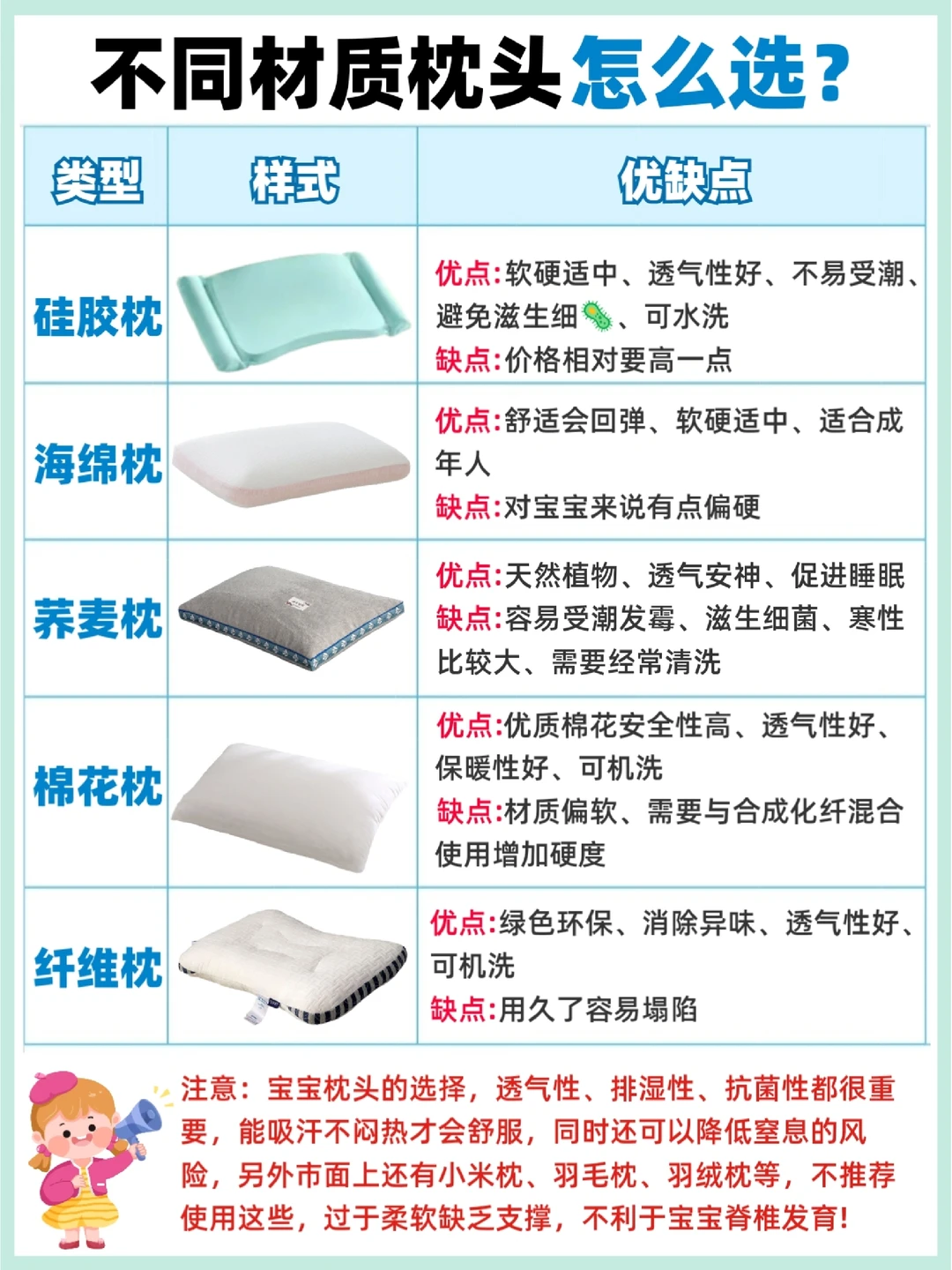 宝宝枕头的款式五花八门,比如荞麦枕、棉花枕、海绵枕、纤维枕、羽绒枕、乳胶枕等等,在挑选时我还专门做了功课,在图片中列举了他们的优缺点,宝妈们可以参考。