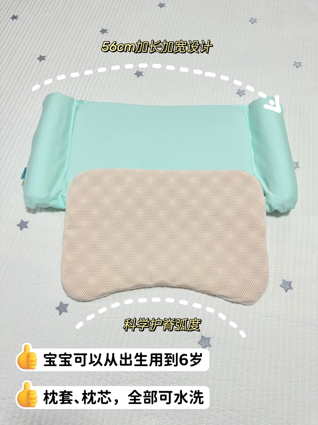 匹配婴童脊柱发育特点,科学分段。配有两个不同高度的枕芯,可以根据年龄调节高度,从1岁用到6岁!!