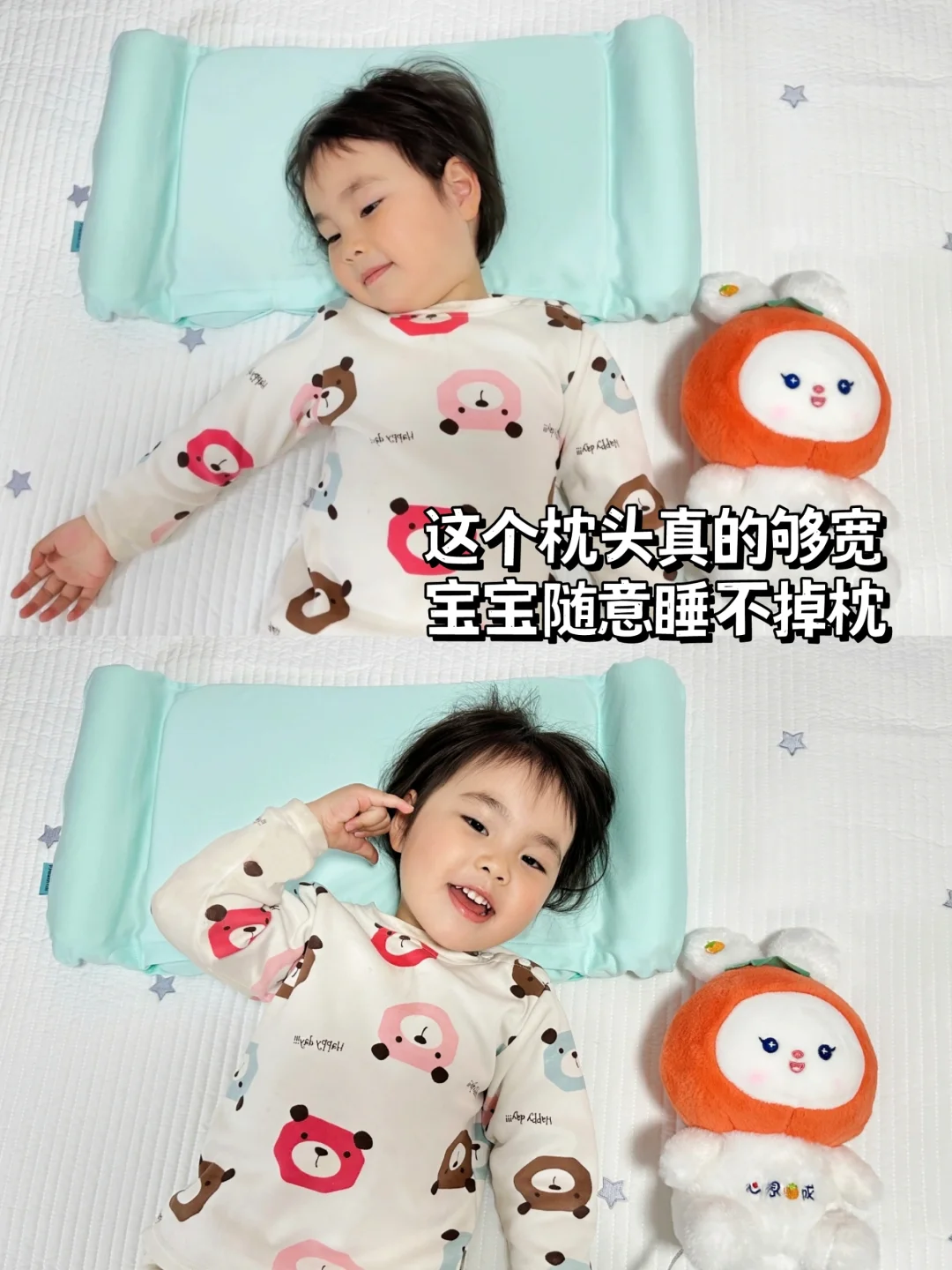 枕头宽度很大,两边还有安抚柱。宝宝晚上睡觉不容易跑位置,无论宝宝什么姿势,小脑袋依然还在枕头上。