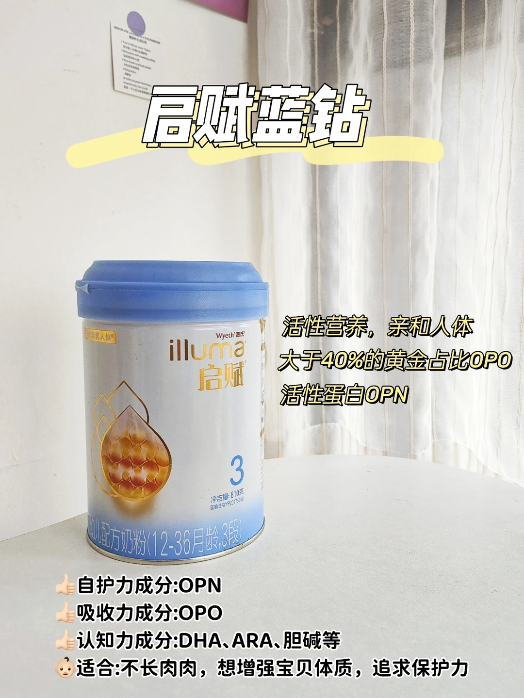 🔵启赋蓝钻添加了>40%的黄金占比的OPO,可提升宝宝对钙和脂肪等营养的吸收,活性因子gsMO有助于宝宝肠胃,还有活性蛋白OPN,能够提升宝宝的自护力,配方比较全。口味清甜,奶香味浓,孩子们挺喜欢喝的~