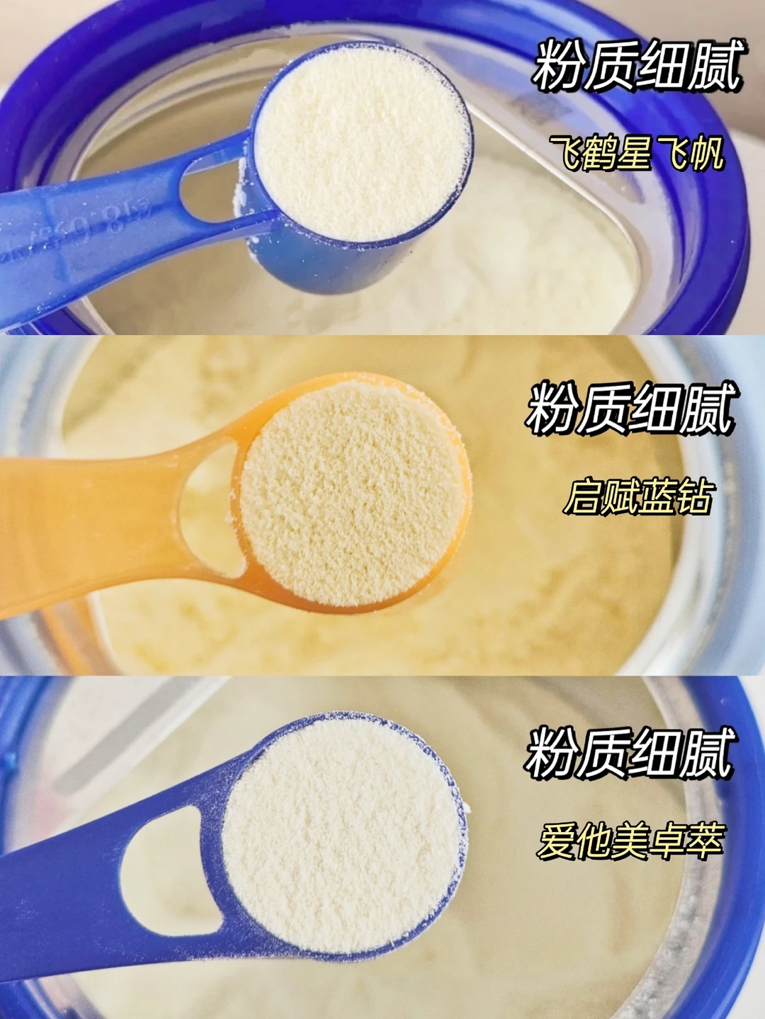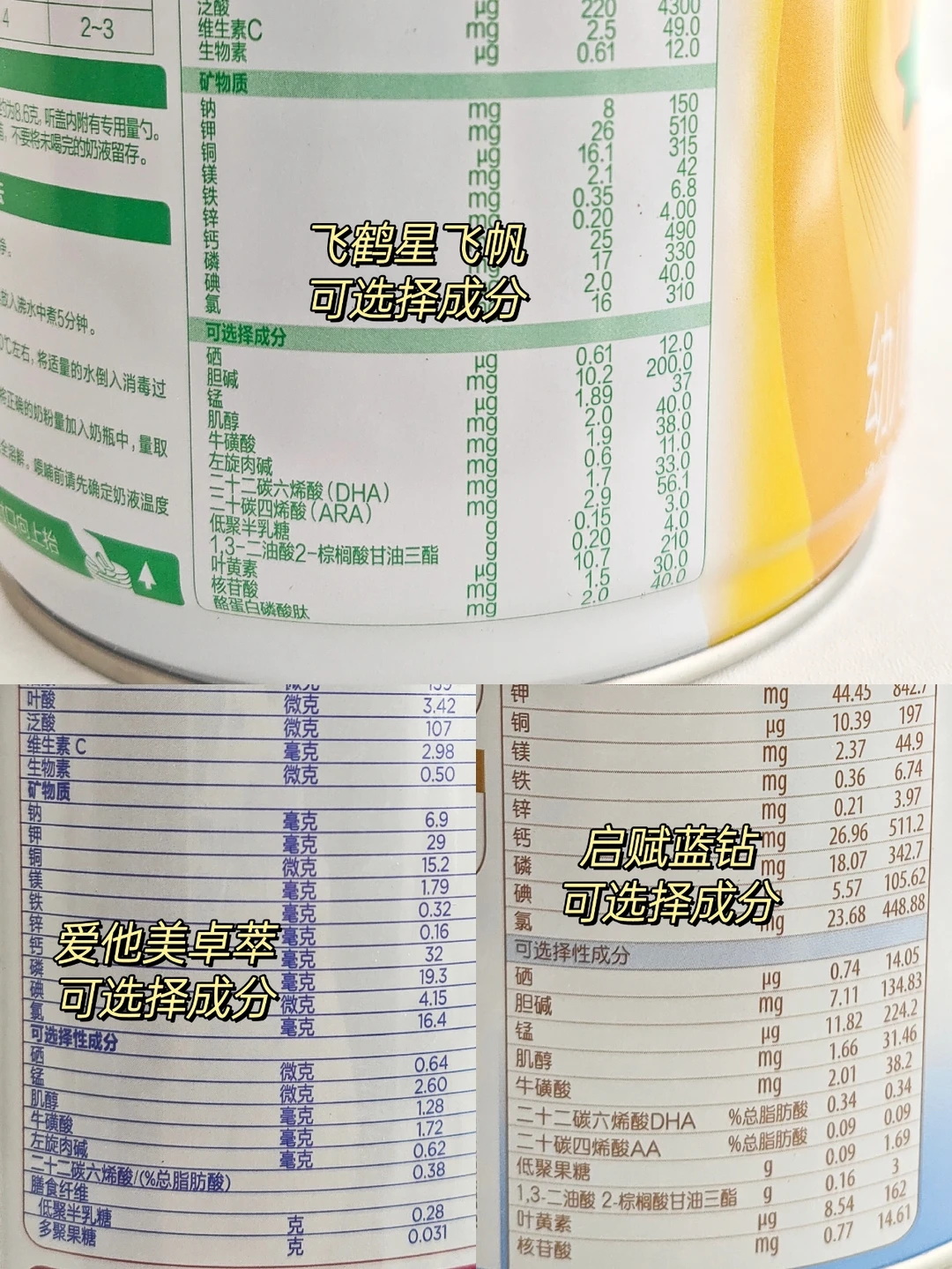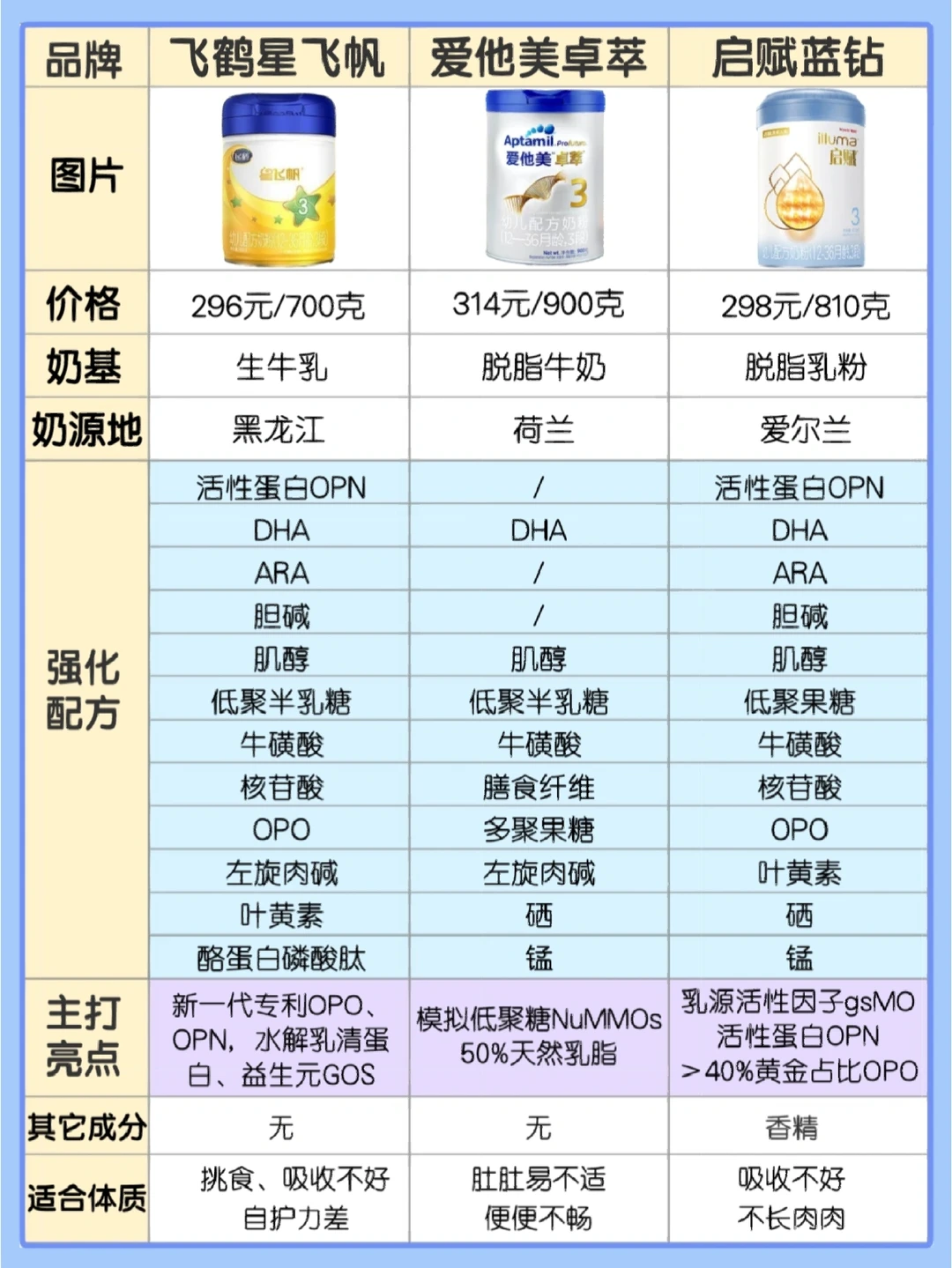 知道这些选奶标准后,我们再来测评这三款奶粉:飞鹤星飞帆、爱他美卓萃、启赋蓝钻