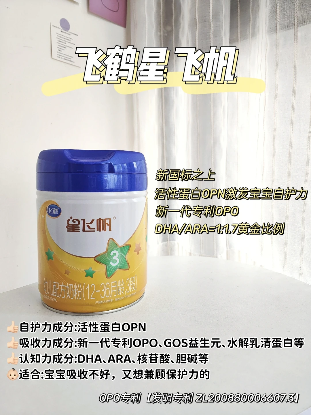 🟠飞鹤星飞帆含有新一代专利OPO结构脂,OPO专利【发明专利 ZL200880006607.3】,它不但升级新国标配方,而且在配方上优于新国标,根据飞鹤奶粉研究成果,它将DHA:ARA设定为1:1.7,更贴合中国宝宝成长曲线和乳源的 “黄金标准”~