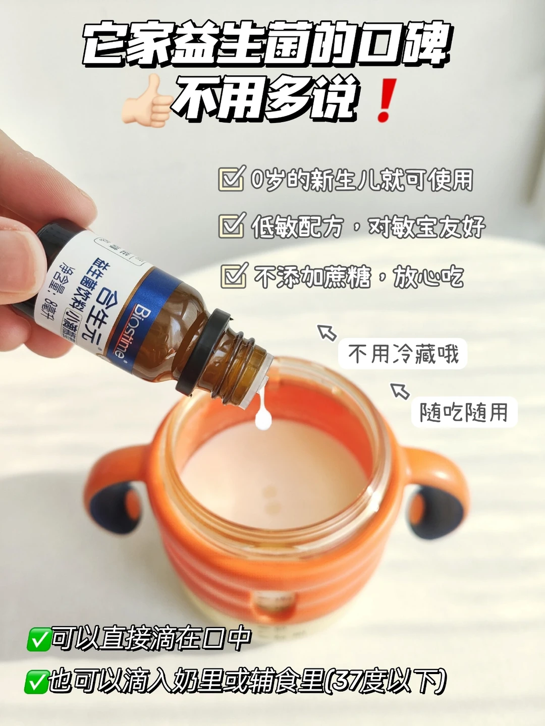 ✔像这种滴剂的设计就特别适合新生儿,又是低敏配方,0岁就可以用,我是直接滴宝宝嘴里的,瓶口设计很方便,准确控量,这个也不需要冷藏,常温避光保存就行,随吃随用,出远门放包包就行😌