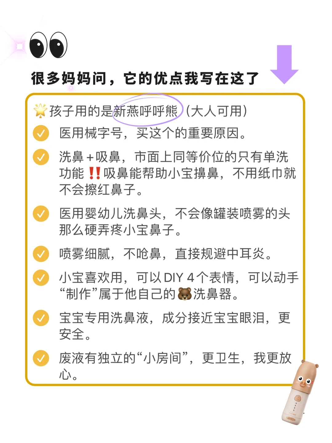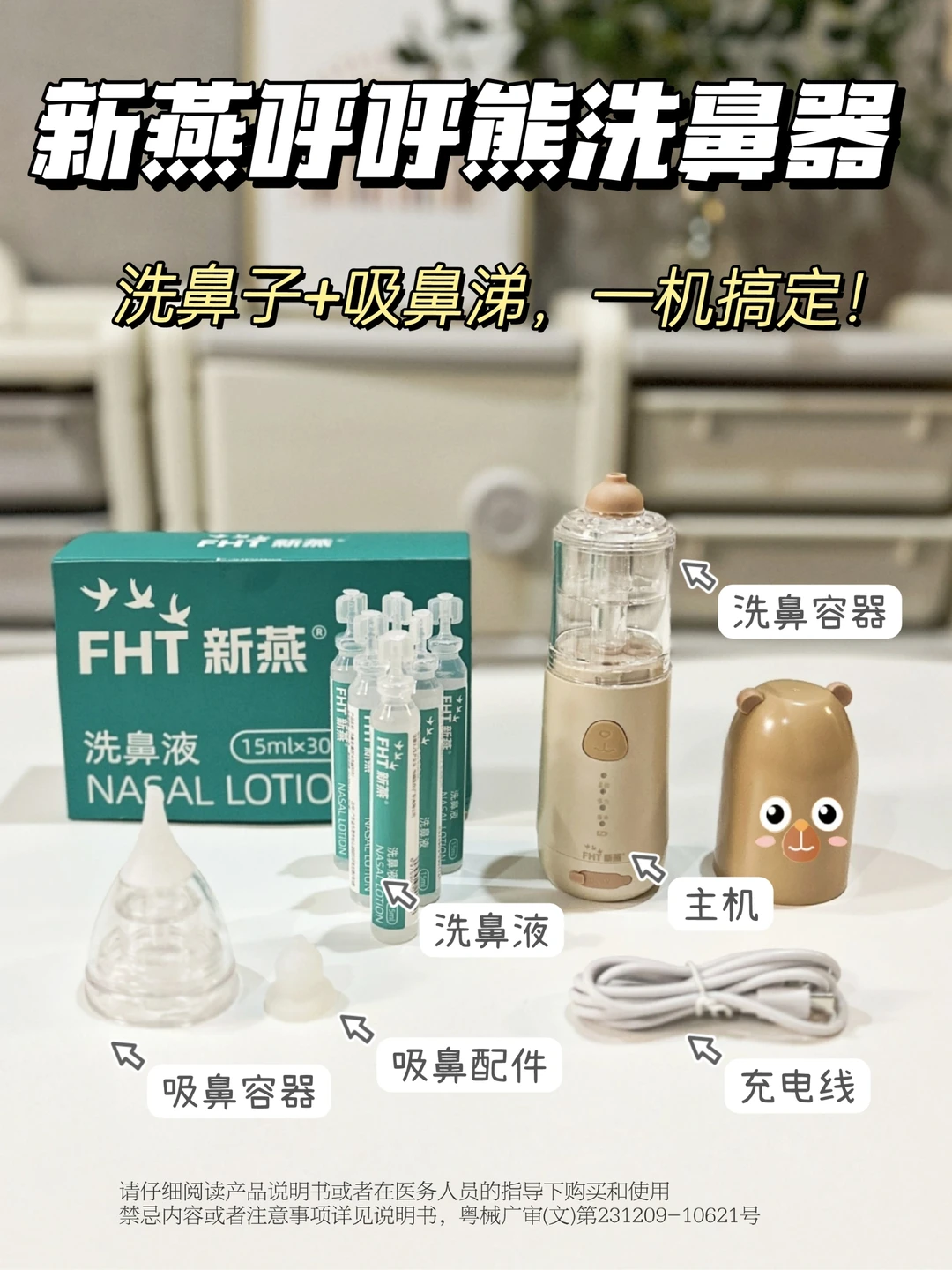 ✅洗鼻器是医 疗器械,不是所有的洗鼻器都可以放心给孩子用,在这一点上我很谨慎。新燕呼呼熊是【医用械字号】的,一定要认准这个。而且可以【 1台=2台用!洗鼻子+吸鼻涕】,这个很少见的!很适合不会擤鼻涕或者鼻涕太浓的小朋友,洗完可以把脏污更彻底地吸走,就不用纸巾擦红宝宝鼻子。新燕呼呼熊搭配一支专业洗鼻液,可以随身放在包里带出门哦~