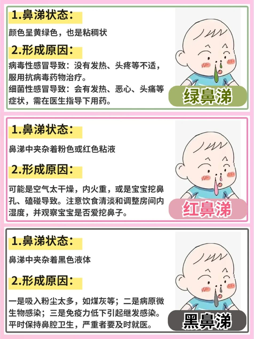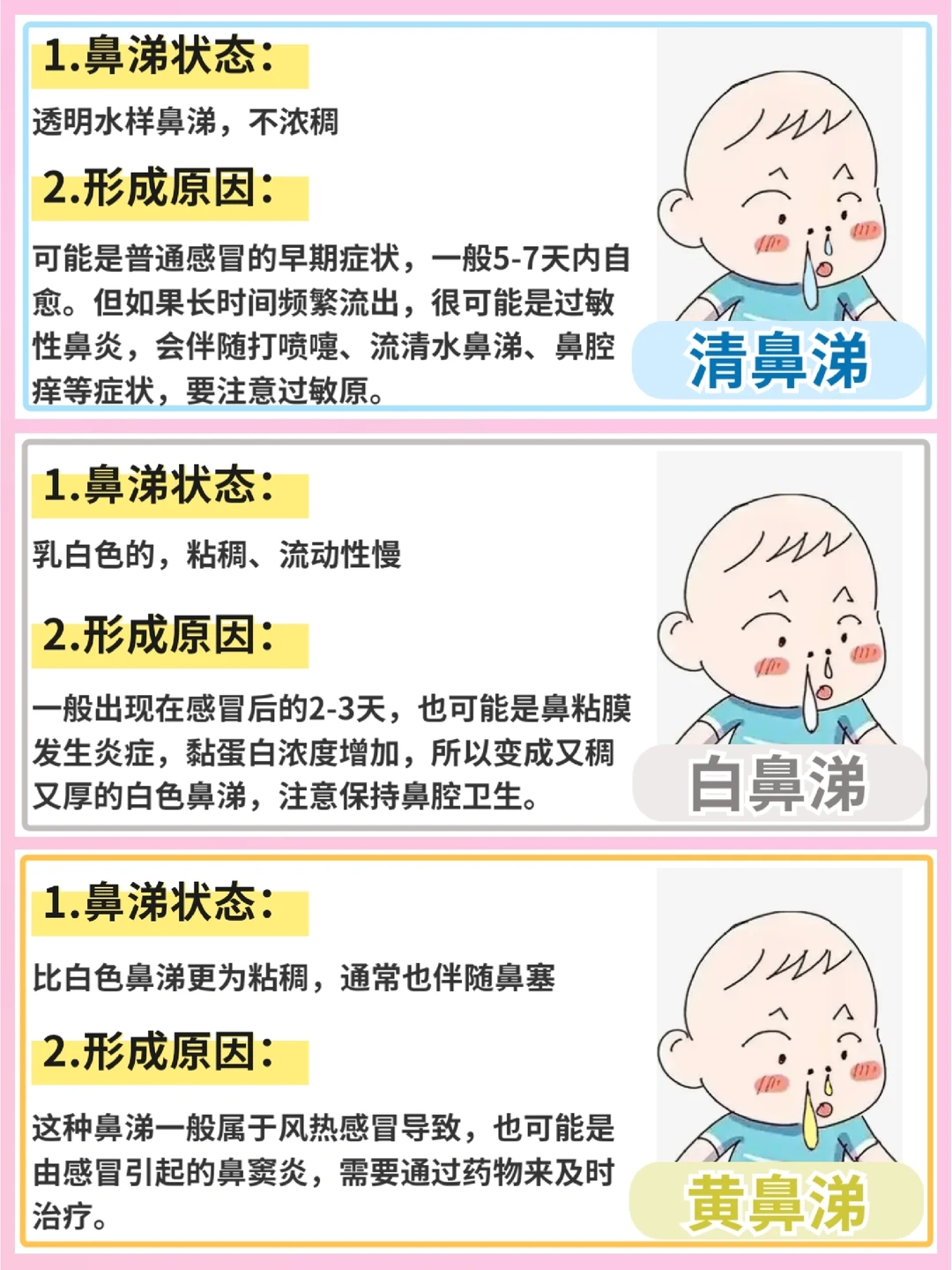 ⚠️宝宝流鼻涕,不能全当感冒处理,不同的鼻涕颜色能反应宝宝呼吸道可能存在的各种问题哦~(详细内容看图片)