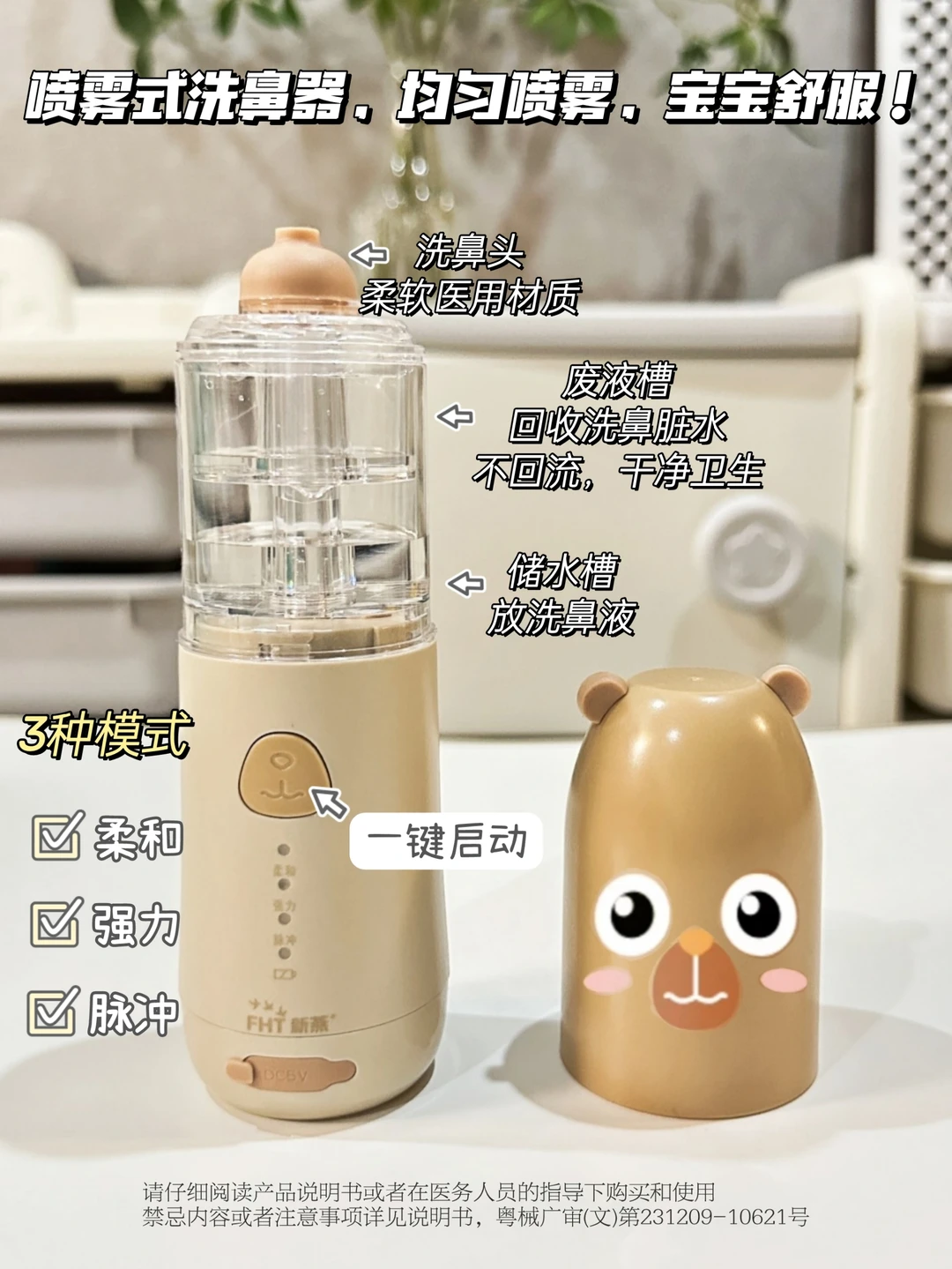 我是很挑剔的人,必须后换成了新燕呼呼熊洗鼻器,水雾细腻,不呛水,这个呼呼熊很可爱,很讨孩子喜欢,现在她每次都自己主动要求要洗鼻子。