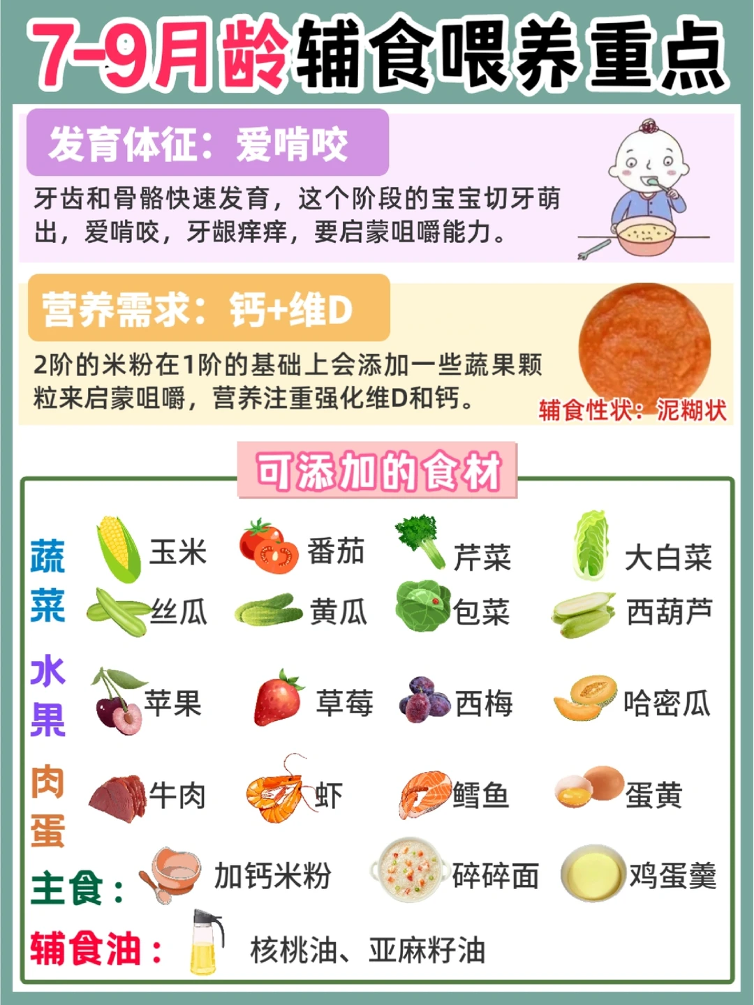 🉑爱咬了,宝宝萌出小牙,喜欢开始咬东西时期就要添加小果蔬颗粒,启蒙宝宝咀嚼力,营养上维D和钙要跟上,也要开始添加辅食油了