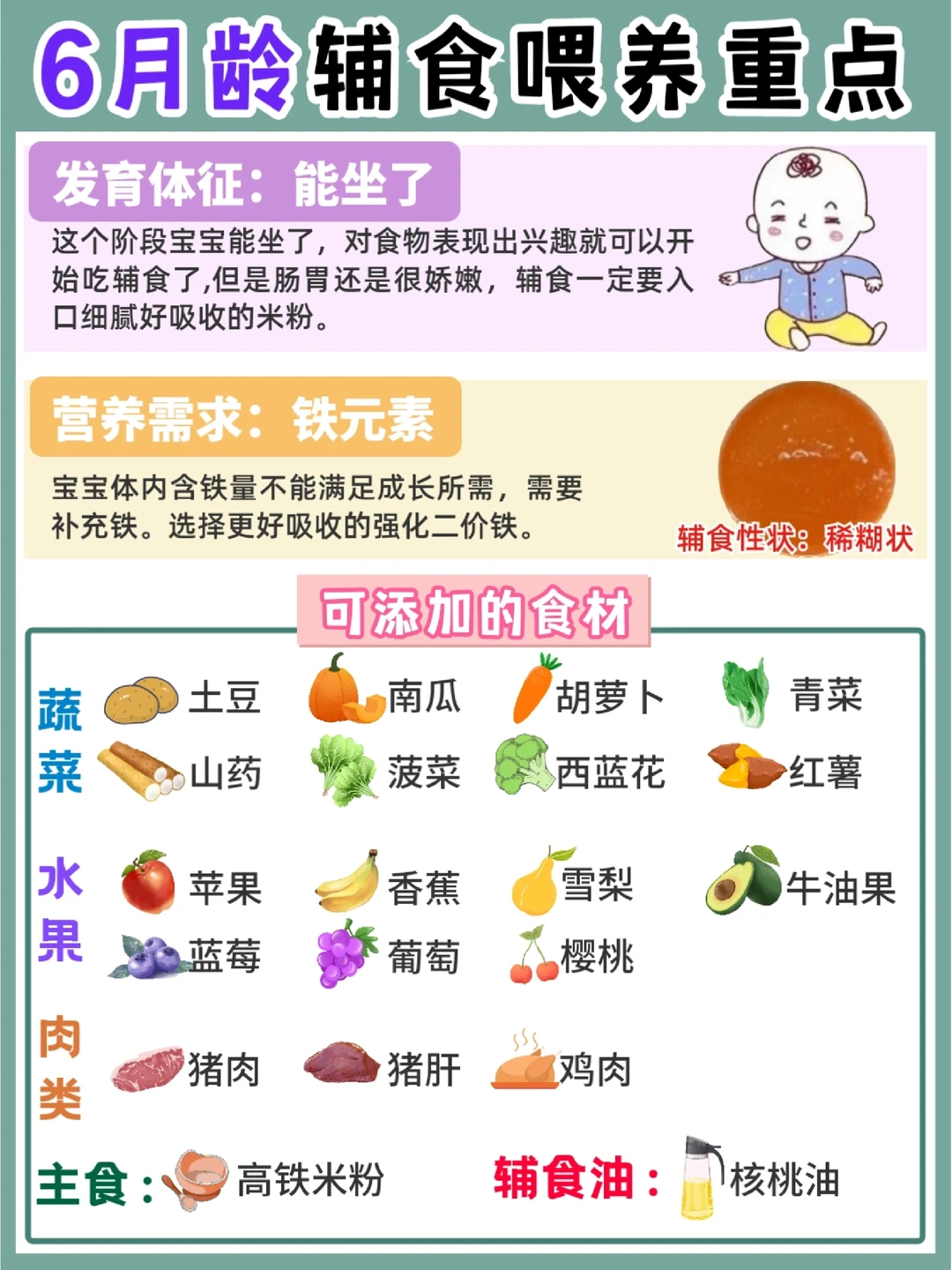 🉑能坐了,颈部能支撑头部重量时就可添加宝宝第 一口辅食了,这时宝宝体内对铁需求很高,所以高铁米粉是必选!