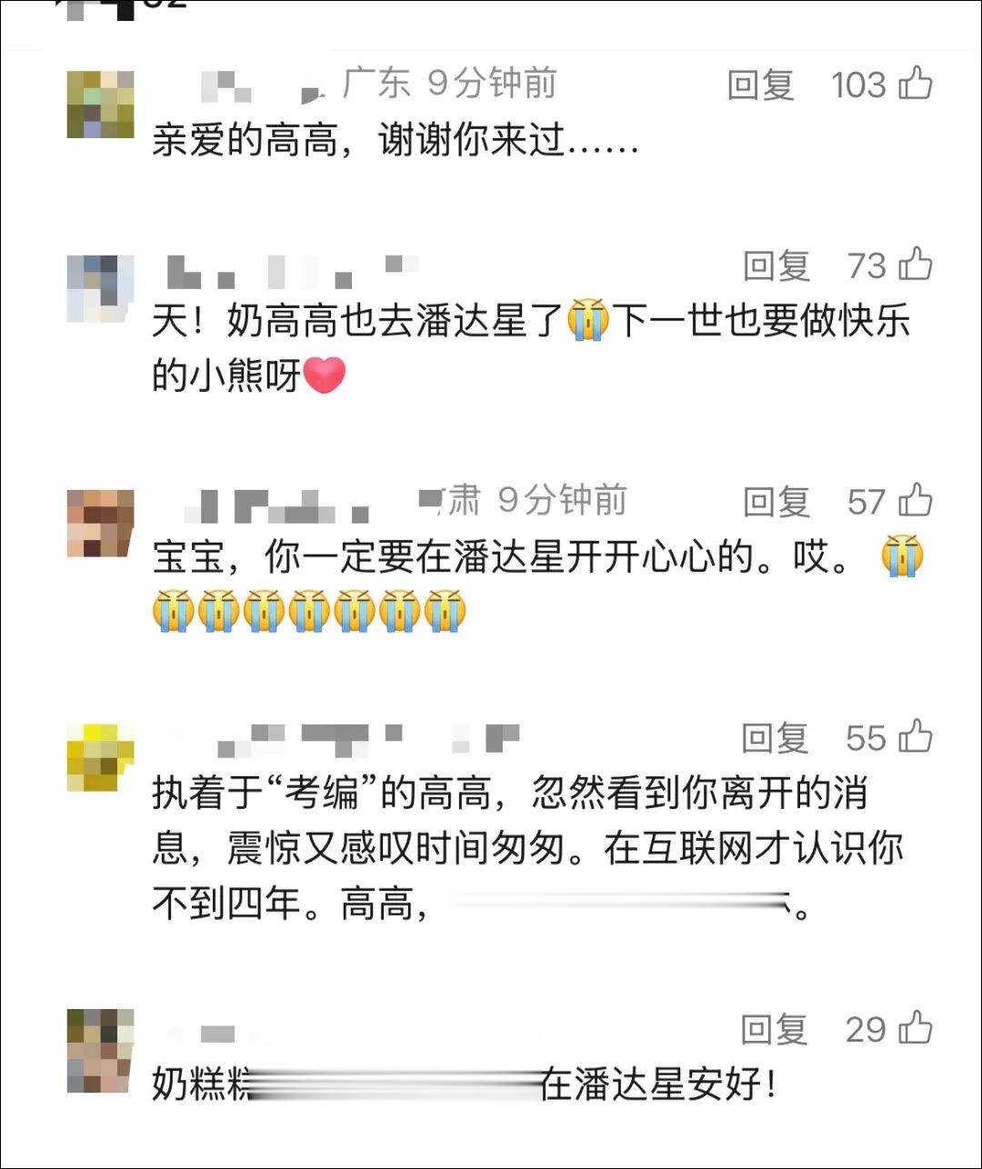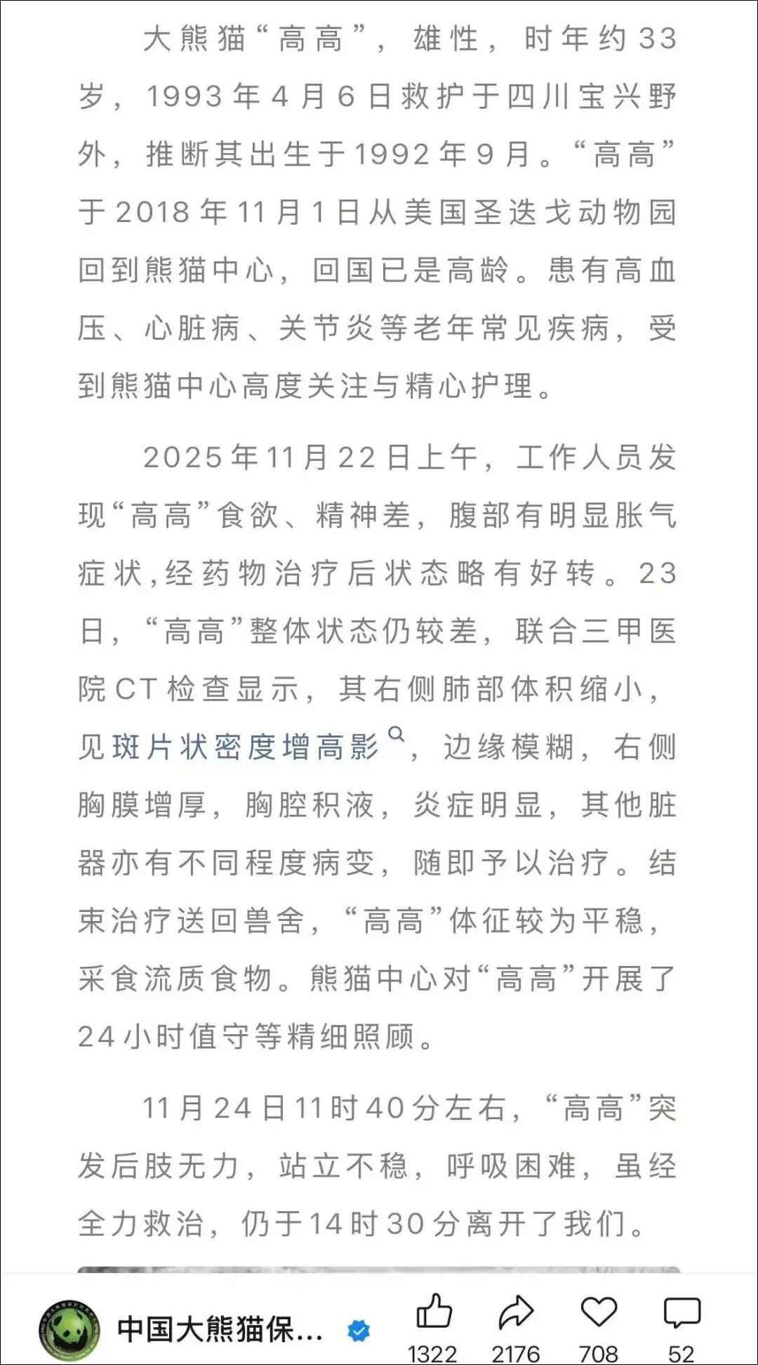11月27日,中国大熊猫保护研究中心发消息称:大熊猫高高去世。雄性大熊猫“高高”,1993年4月6日救护于四川宝兴野外,2003年旅居美国圣地亚哥动物园,2018年11月1日结束旅居生活,回到熊猫中心。于2025年11月24日14时30分离开了我们。此别山海隔,“高高”一路走好……