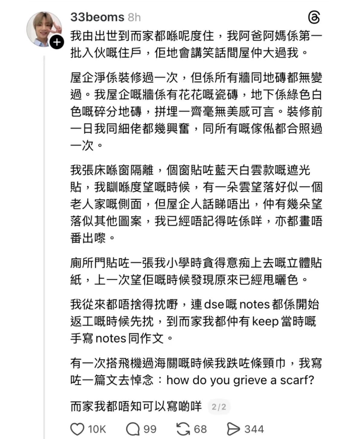 看得人太难过了……“原来人是可以突然间失去所有东西的刚买完一套衣服和梳洗用品在去亲戚家的路上突然发现我身上的东西就是我拥有的全部二十几年人生累积的痕迹 仿佛从未存在过this is my first death我从出生到现在都住这里,我爸妈是第一批入住的住户,他们会开玩笑说这房子比我还老。家里只装修过一次,但所有墙砖和地砖都没换过。我家的墙是带花纹的瓷砖,地面是绿白相间的碎花地砖,拼在一起毫无美感可言。装修前一天我和弟弟特别兴奋,和所有家具都合了影。我的床在窗边,窗户贴着蓝天白云款的遮光贴膜。当我躺在床上仰望时,有一朵云看起来像老人的侧脸,家里人都说看不出。还有几朵像其他图案的云,我现已记不清具体样子,也画不出来了。厕所门上贴着一张我小学时淘气贴上的立体贴纸,上次看到它时,才发现早已褪尽了颜色。我从来舍不得扔东西,连DSE(香港中学文凭考试)的复习笔记都是开始工作后才丢弃的。直到现在我还留着当时手写的笔记和作文。有次搭飞机过安检时弄丢了一条围巾,我还为此写了篇文章:《如何为一条围巾哀悼》。而如今,我竟不知该写下什么。”