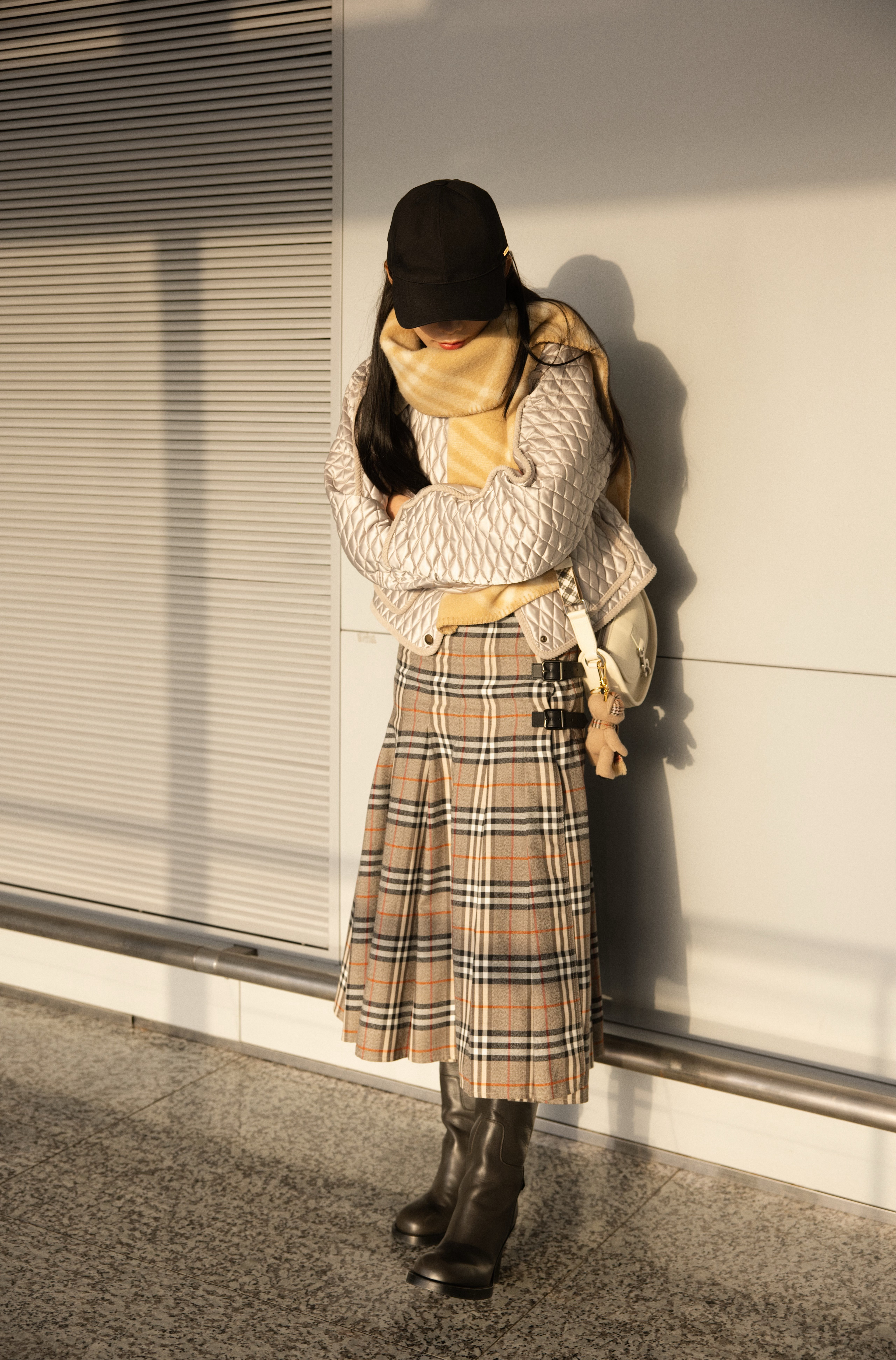 陈丽君机场Look再次演绎全套奢牌时装,身着Burberry菱形绗缝外套搭配格纹半裙、羊绒围巾、高筒靴、单肩包,带来温暖的英伦格调,漂亮的,君君和品牌的合作也是相当契合哈~