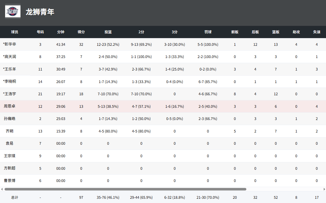 龙狮青年队:彰华非32分、王浩宇18分、周恩卓13分