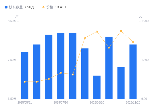 日期A股户数(户)流通A股户均持股数(股)户均持股市值(万元)2025-11-207900037865.9450.782025-09-307322040855.0858.182025-09-108100036930.9847.862025-08-107100042132.5259.832025-07-317800038351.4052.622025-07-208200036480.6039.732025-07-108200036480.6040.202025-06-308153436689.1038.712025-06-207900037865.9439.122025-05-317700038849.4740.13