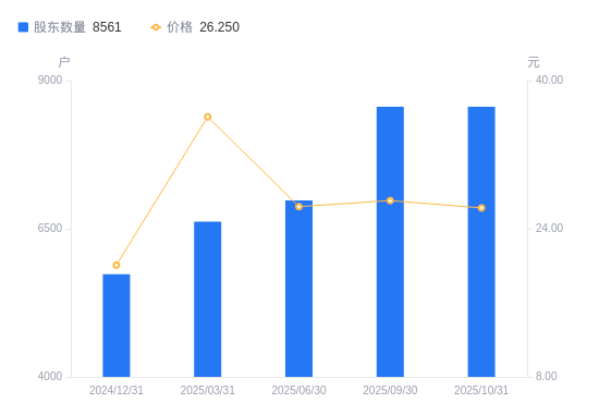 日期A股户数(户)流通A股户均持股数(股)户均持股市值(万元)2025-10-31856113458.4835.332025-09-30856113458.4836.392025-06-30697616516.3543.592025-03-31662117401.9162.802024-12-31573220090.4540.322024-09-30608018940.5334.552024-06-30667817244.4526.912024-03-31629918282.0240.612023-12-31566520328.0670.102023-09-30528821777.3192.78