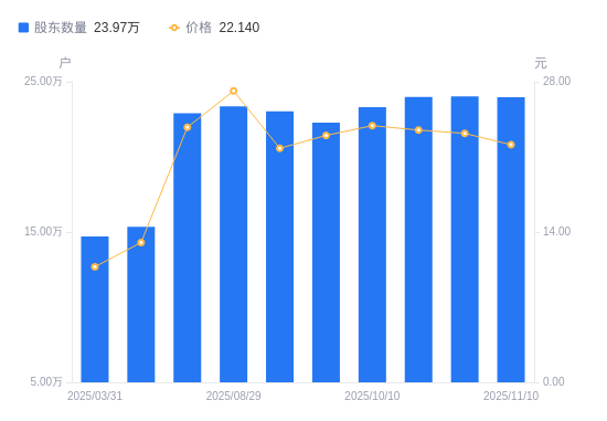 日期A股户数(户)流通A股户均持股数(股)户均持股市值(万元)2025-10-312402167296.8816.922025-10-202398917306.7617.172025-10-102331627517.6317.972025-09-302228517865.4618.092025-09-102303167610.5316.592025-08-292336987500.3920.362025-08-202289557655.7718.192025-06-3015352811416.9814.862025-03-3114714611912.1612.822024-12-3115146211572.7211.72