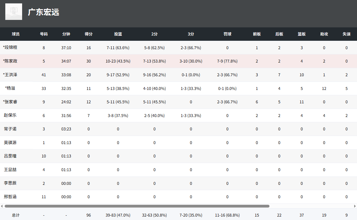 广东U19男篮:陈家政30分、王洪泽20分、段锦瑄16分