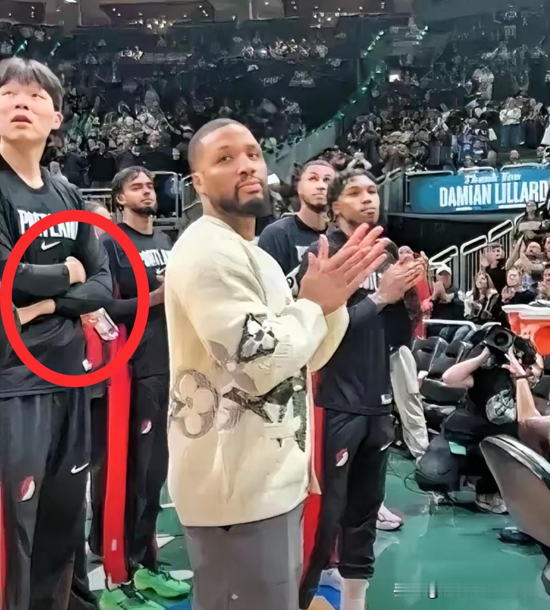 看杨瀚森这行为显得特别格格不入 就单凭这一点他就无法立足开拓者 人家大屏幕播放致敬利拉德的视频 作为利拉德的队友全都起立为老大鼓掌 唯独杨瀚森显得那么突兀,双手抱胸 就这样呆呆的看着,好像根本不关自己事 相信换做随便一个人都不会是这样的反应 也不会出现这样尴尬的场面,这是最基本的礼貌 连这一点常识都没有,怎么在NBA混下去 实力不行也就算了,你这样还是早点回国吧!