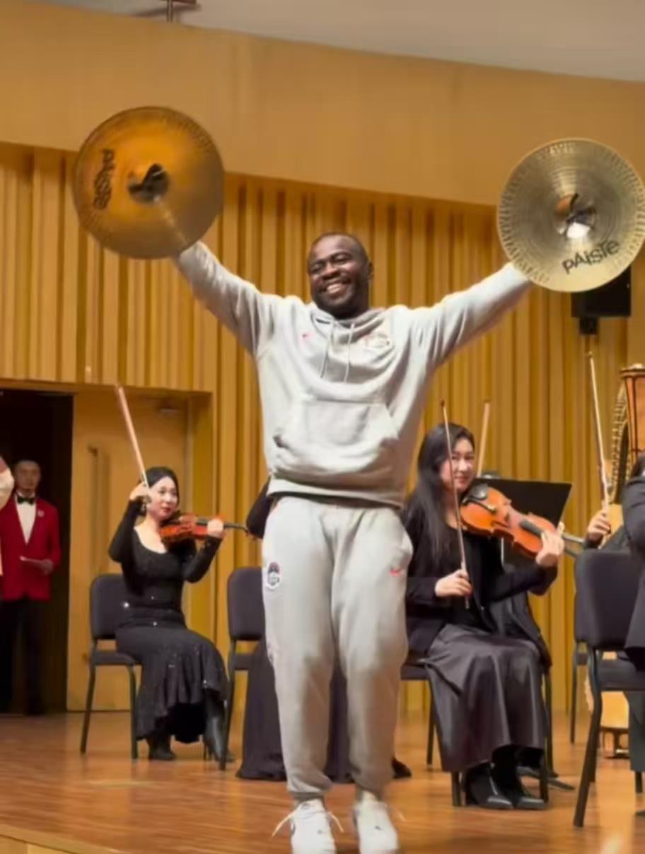 据网友发布视频,阿奇姆彭在观众的惊呼声中手持乐器镲登台,随着乐曲节奏击打摆动,身体也同步舞动,表演得十分尽兴。一曲完毕,他仍难掩激动,还转了几个圈。网友评论道:“他玩得太开心了”“下一个赛季可以从河南足球俱乐部转会到交响乐团”。