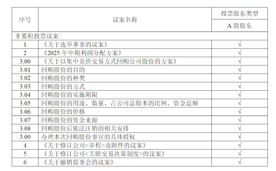公告显示,贵州茅台2025年第一次临时股东大会将审议《关于选举董事的议案》《2025年中期利润分配方案》《关于以集中竞价交易方式回购公司股份的方案》《关于修订公司〈章程〉及附件的议案》《关于修订公司〈关联交易决策制度〉的议案》《关于撤销监事会的议案》等6项议案。