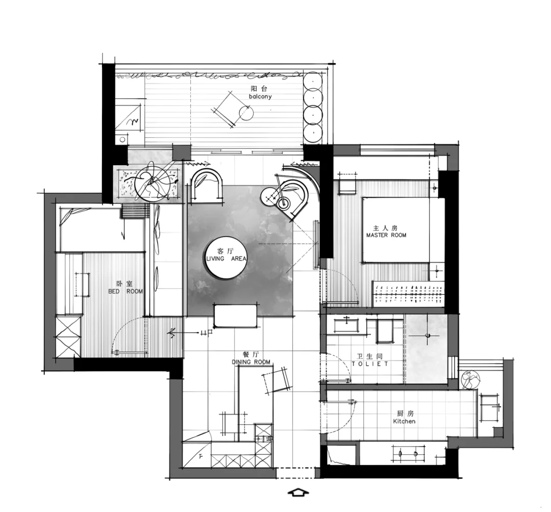 客户需求: 保留两个房间 大大的客厅 有设计感的客厅 扩大卫生间 扩大厨房