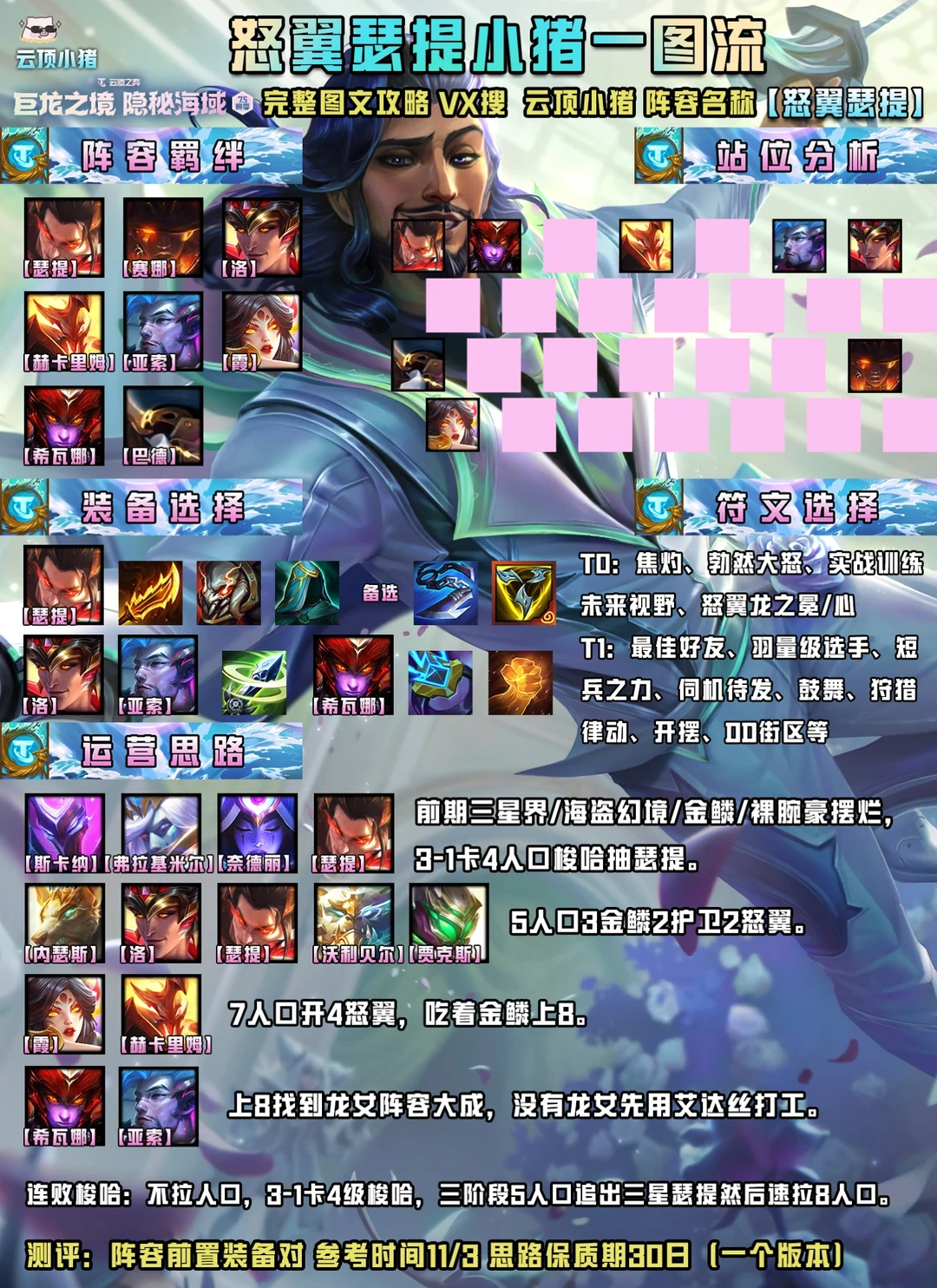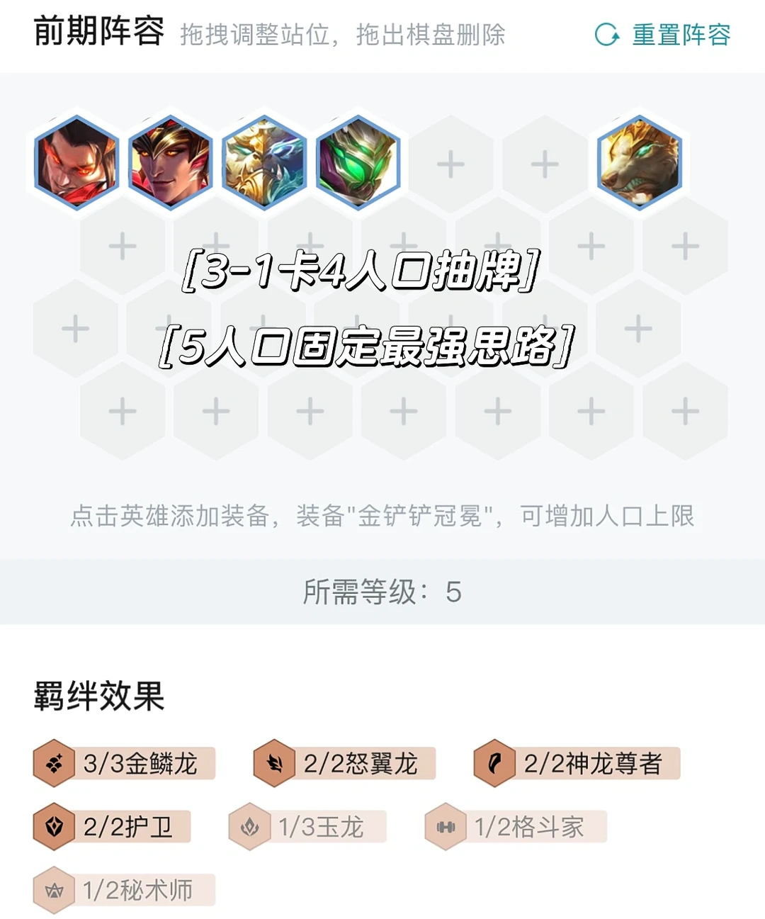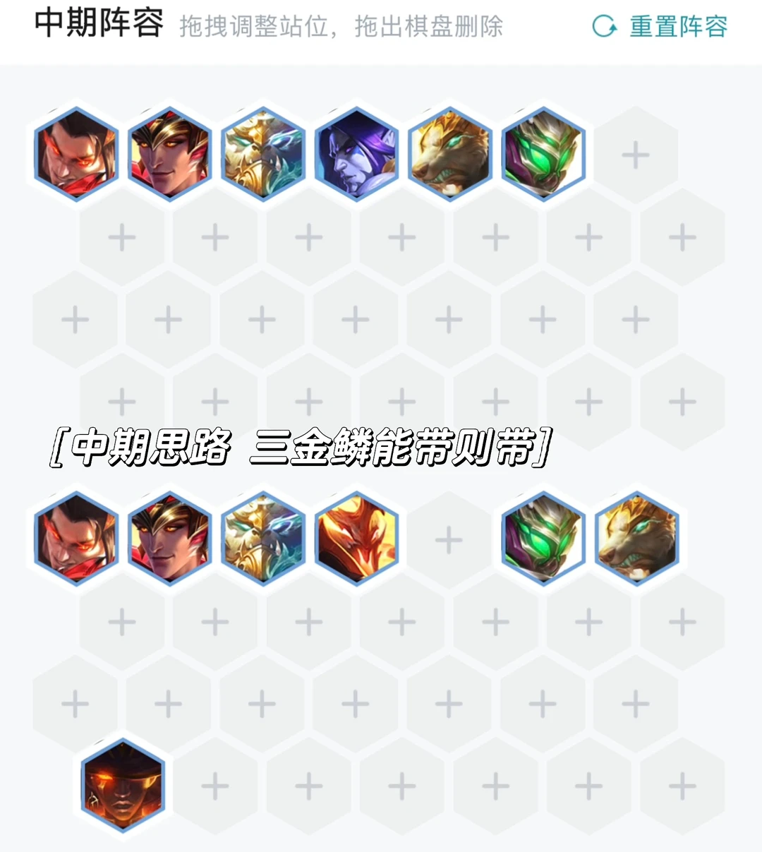 3-1梭哈找出三星瑟提或者最少要6、7只,然后5人口固定3金鳞2护卫2怒翼龙最强而且能兼顾经济,赛娜不卡格子经济也可以追三星。