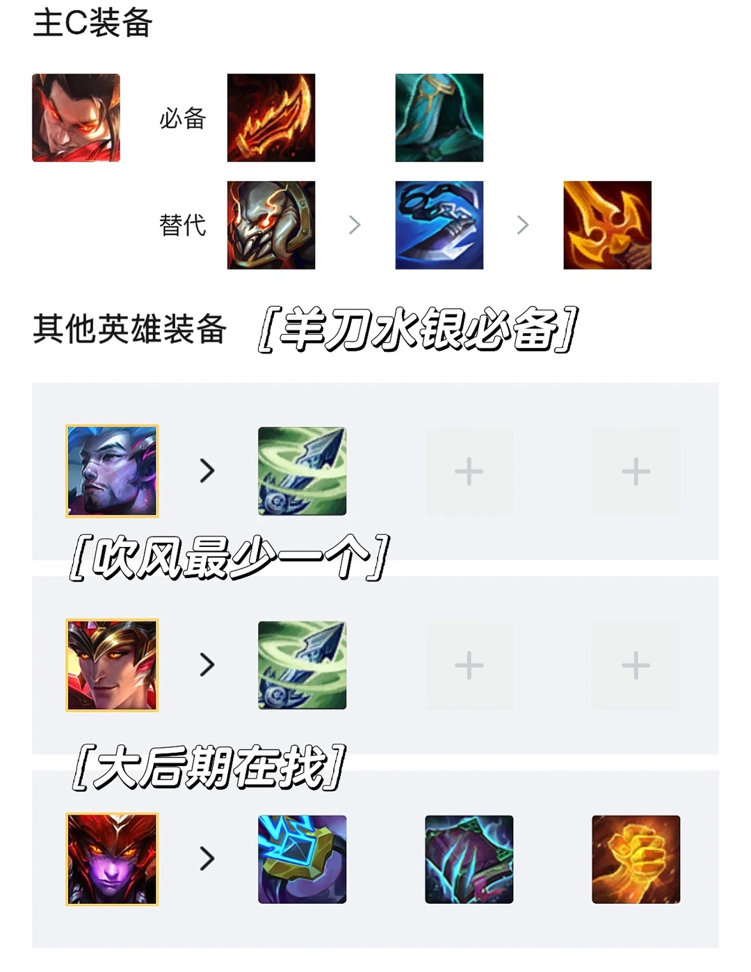 [火R]装备思路:瑟提刚需是羊刀和水银,一定不能没有。第三件泰坦巨杀都行,官方大数据泰坦胜率比巨杀稍微高一点点点,一般有啥合啥。瑟提两件套后做不成装就优先做吹风,至少至少要一个,对局胜率能提升1-2层。