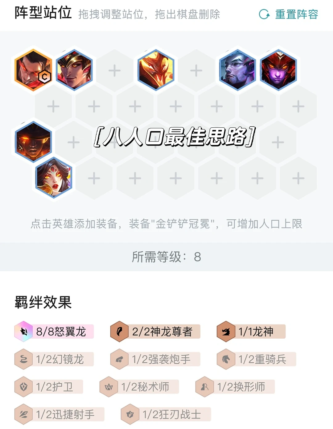 找到三星瑟提之后直接速8人口,中期不要抽牌,除了瑟提什么卡都可以不追三星。5-1左右拉8,找到龙女即可锁血。