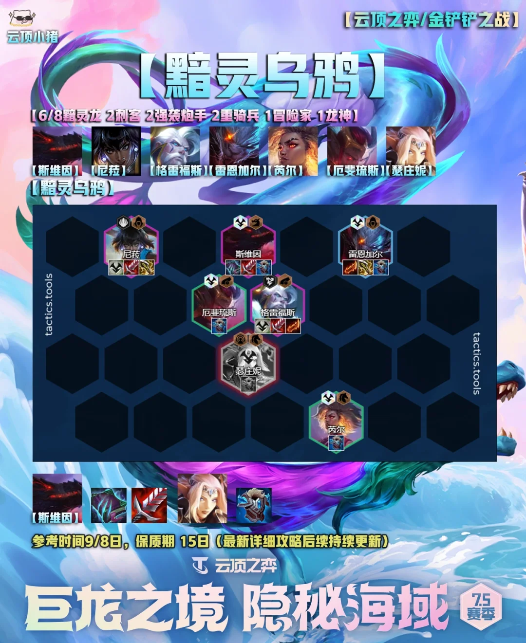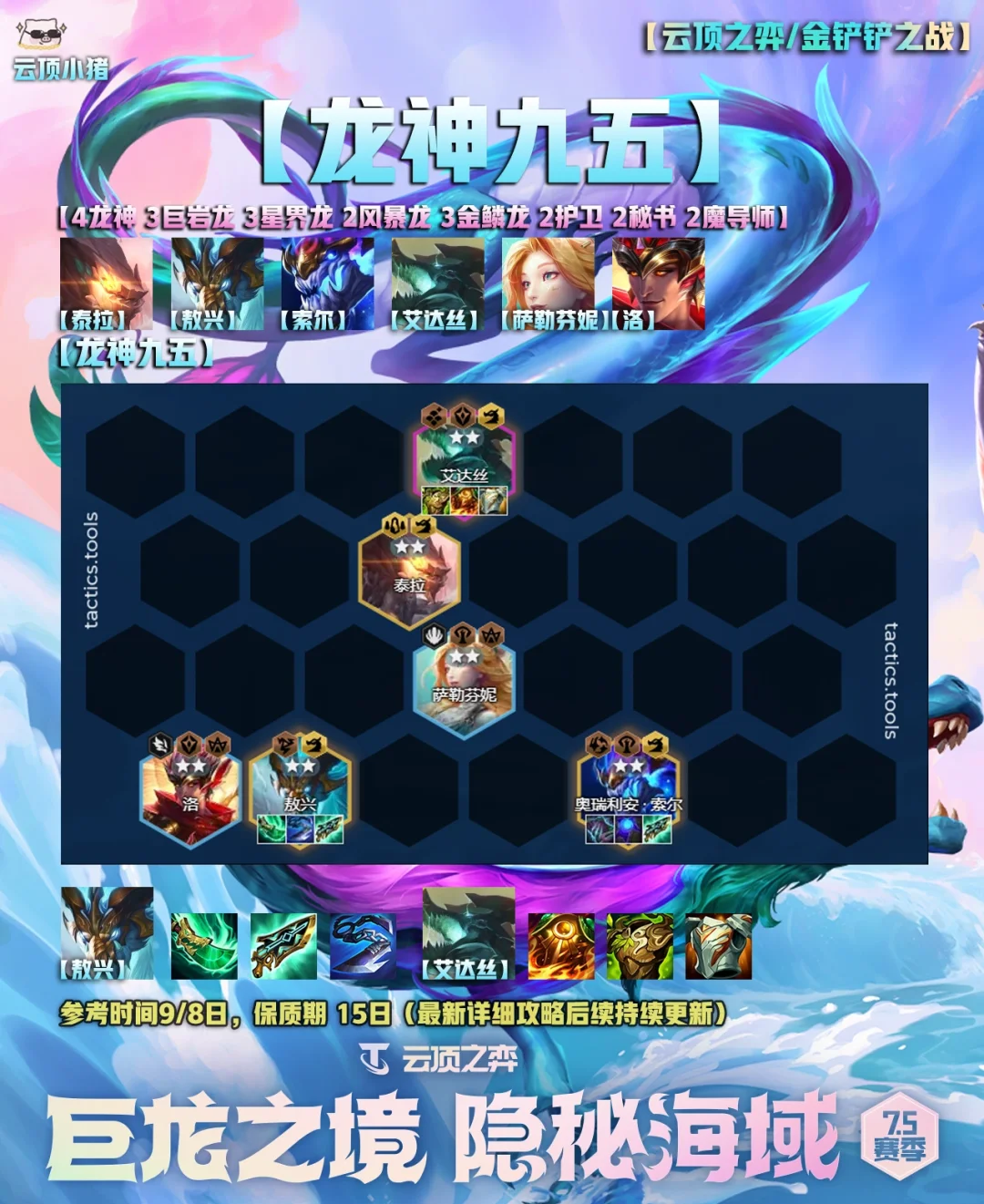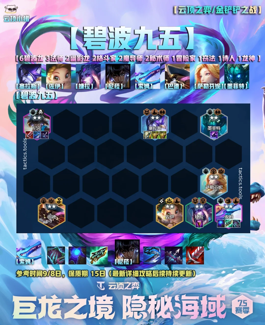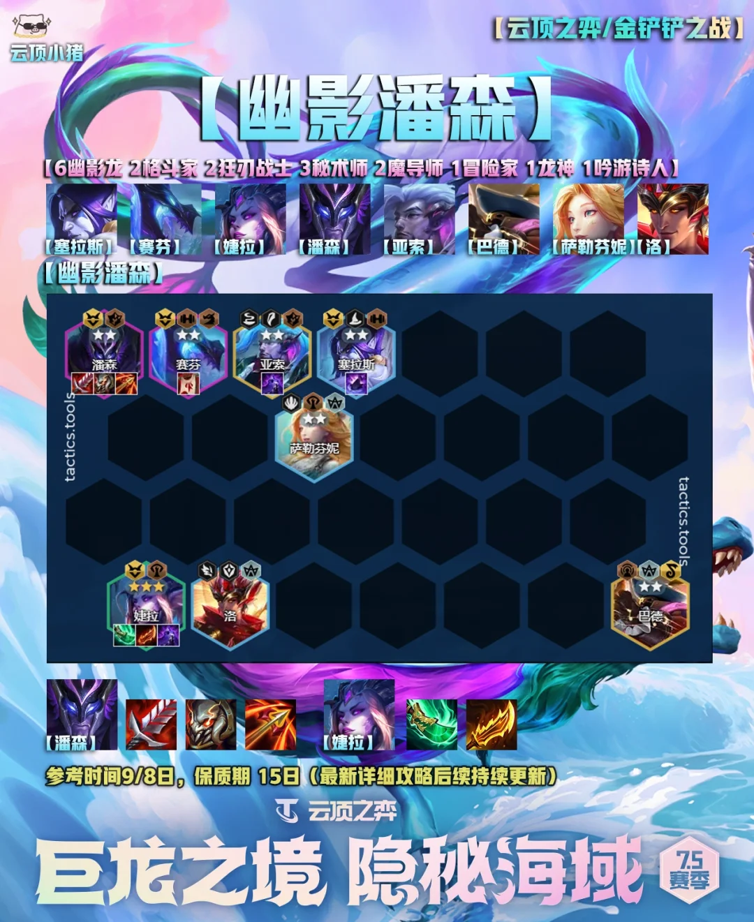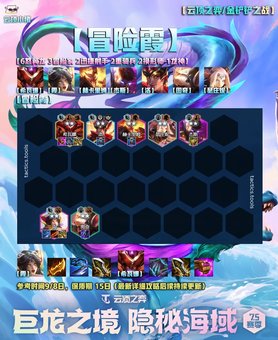 [萌萌哒R]大家好,我是小猪! [doge]明早国服就更新云顶之弈S7.5了,在这里小猪给大家准备了五套美测比较好用的阵容,很多小伙伴没有玩体验服,所以第一天先熟悉一下棋子和羁绊,不用太着急排位分数。 [生气R]从明天开始,小猪会持续加班日更最新的版本答案、思路,季中版本有初始段位重置,所以上分会很快! [害羞R]这里也希望感谢大家这么久对我支持~ [赞R]单套具体的保姆明天开始更新!因为说实话现在也不知道具体的版本答案是啥,所以不做无用功。