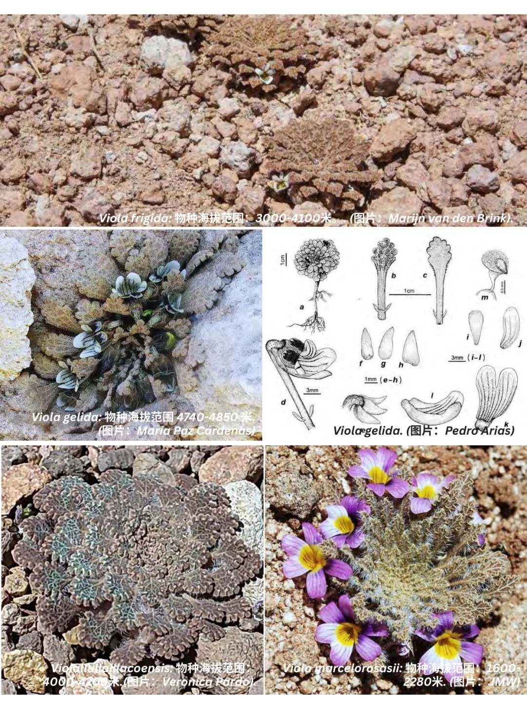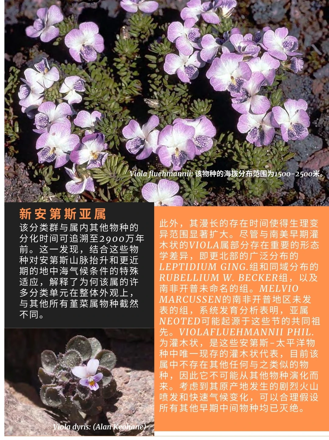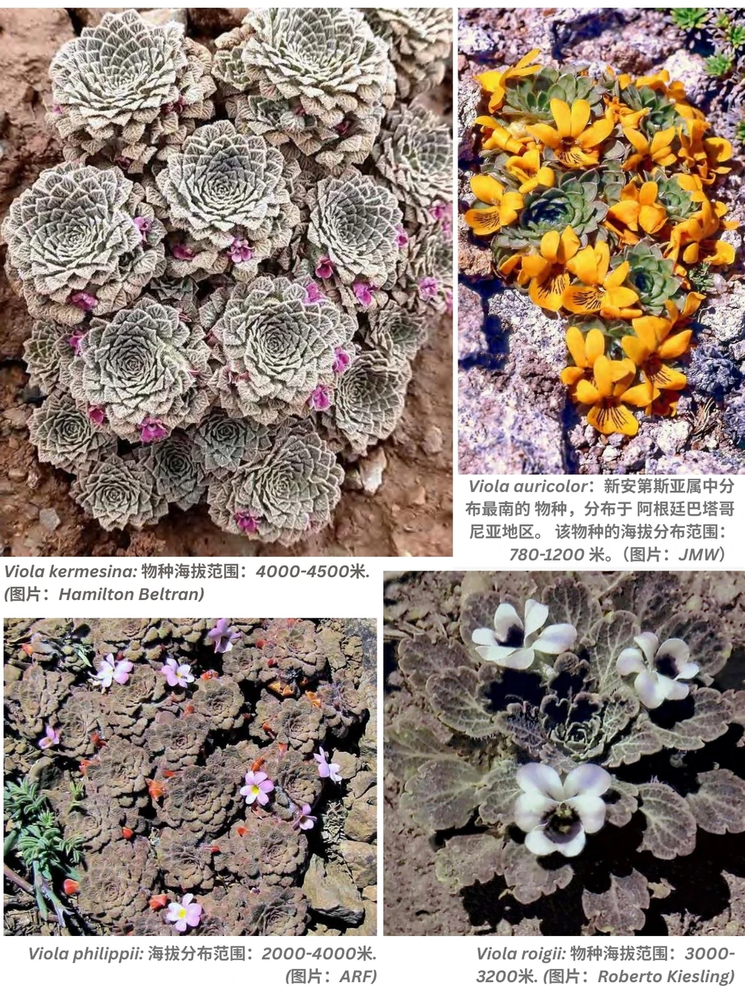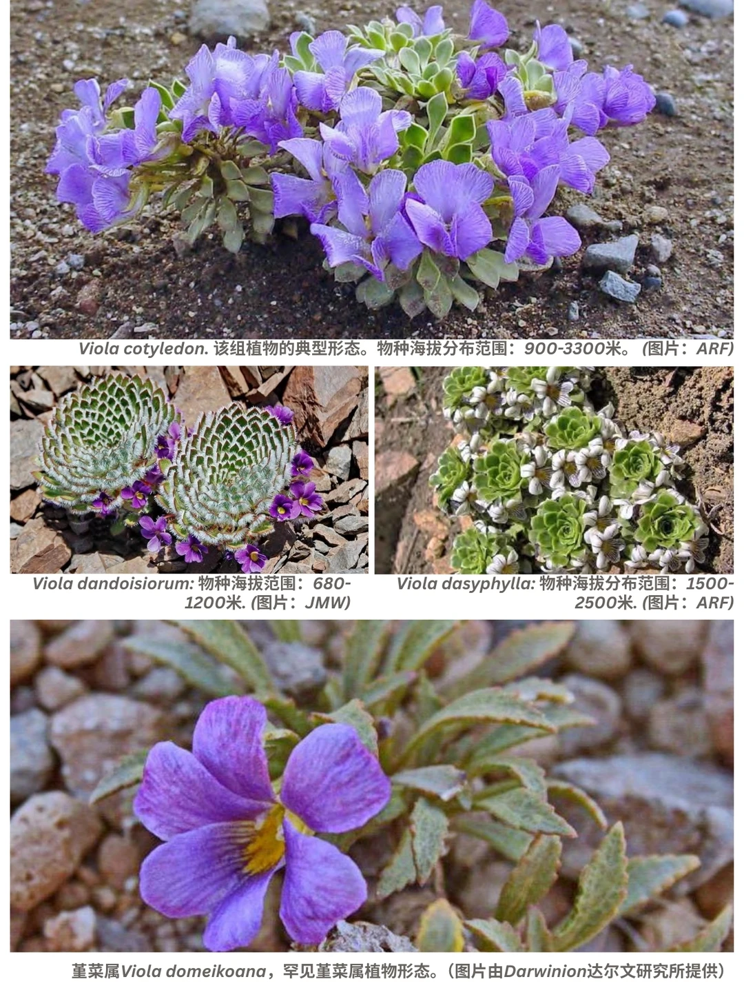 安第斯山脉 高山植物 堇菜科 堇菜属 Viola 莲座 该分类群与属内其他物种的分化时间可追溯至2900万年前。这一发现,结合这些物种对安第斯山脉抬升和更近期的地中海气候条件的特殊适应,解释了为何该属的许多分类单元在整体外观上,与其他所有堇菜属物种截然不同。