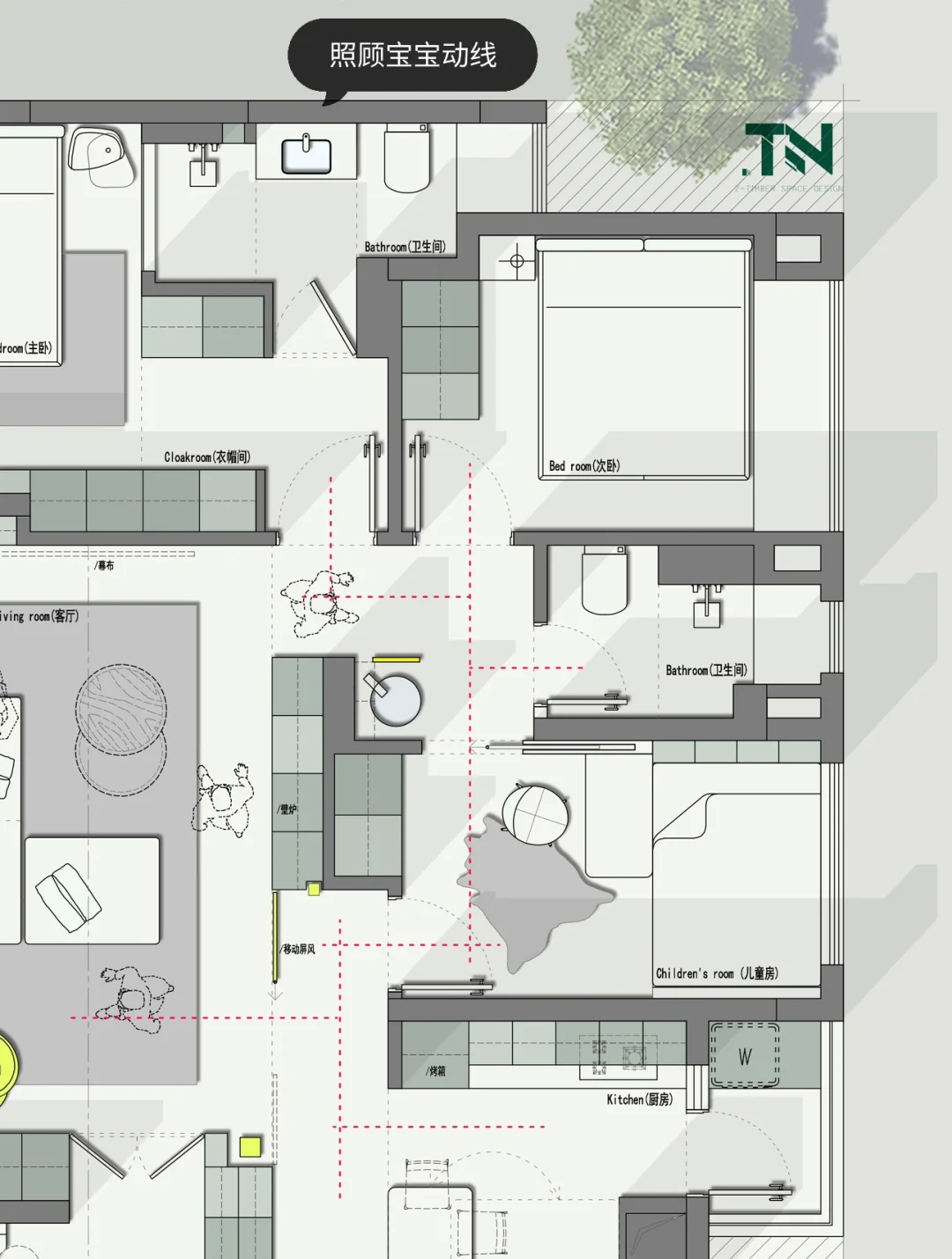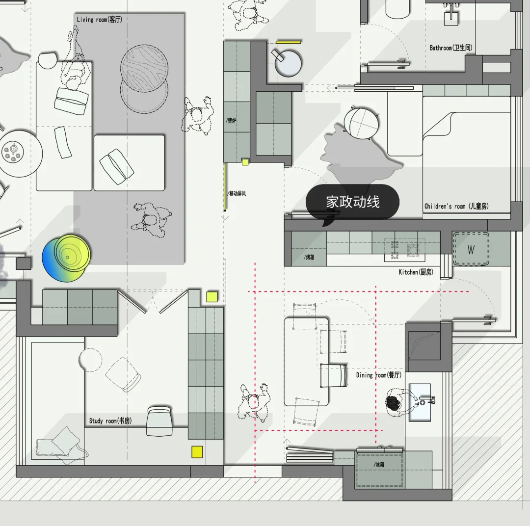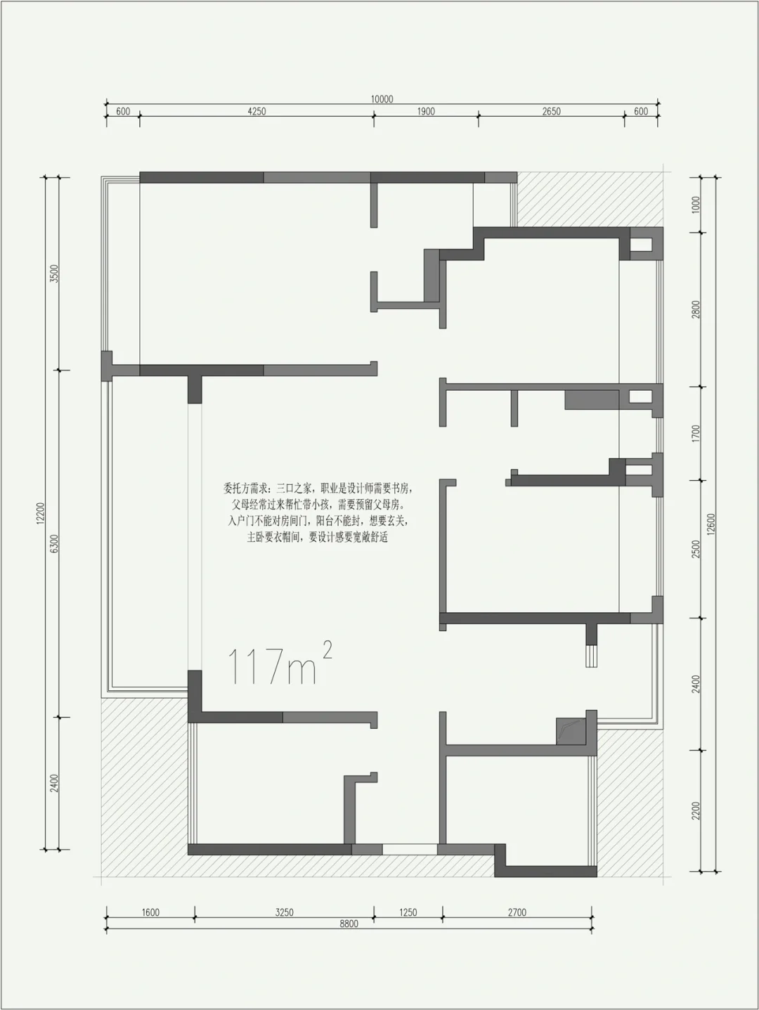 委托方需求: 1、三口之家,职业是设计师需要书房, 2、父母经常过来帮忙带小孩,需要预留父母房。 3、入户门不能对房间门,阳台不能封,想要玄关, 4、主卧要衣帽间,要设计感要宽敞舒适 在条件允许不封阳台情况下让客厅和阳台没有边界,可开可合打造为一个空间,更加有层次感,阳光直接透过阳台进入到客厅中,带来更加舒适的体验,从而对在这里居住的人带来抚慰。