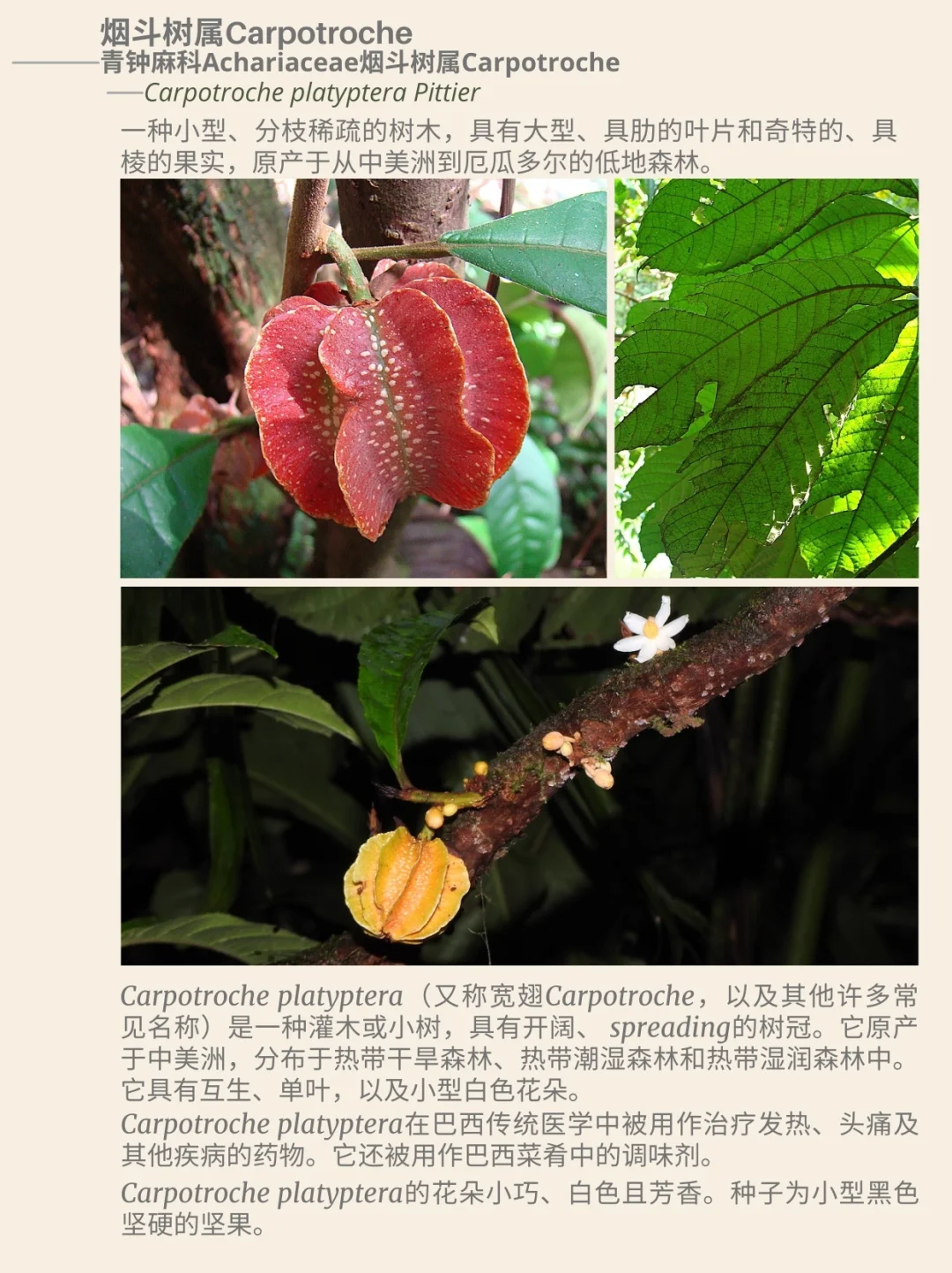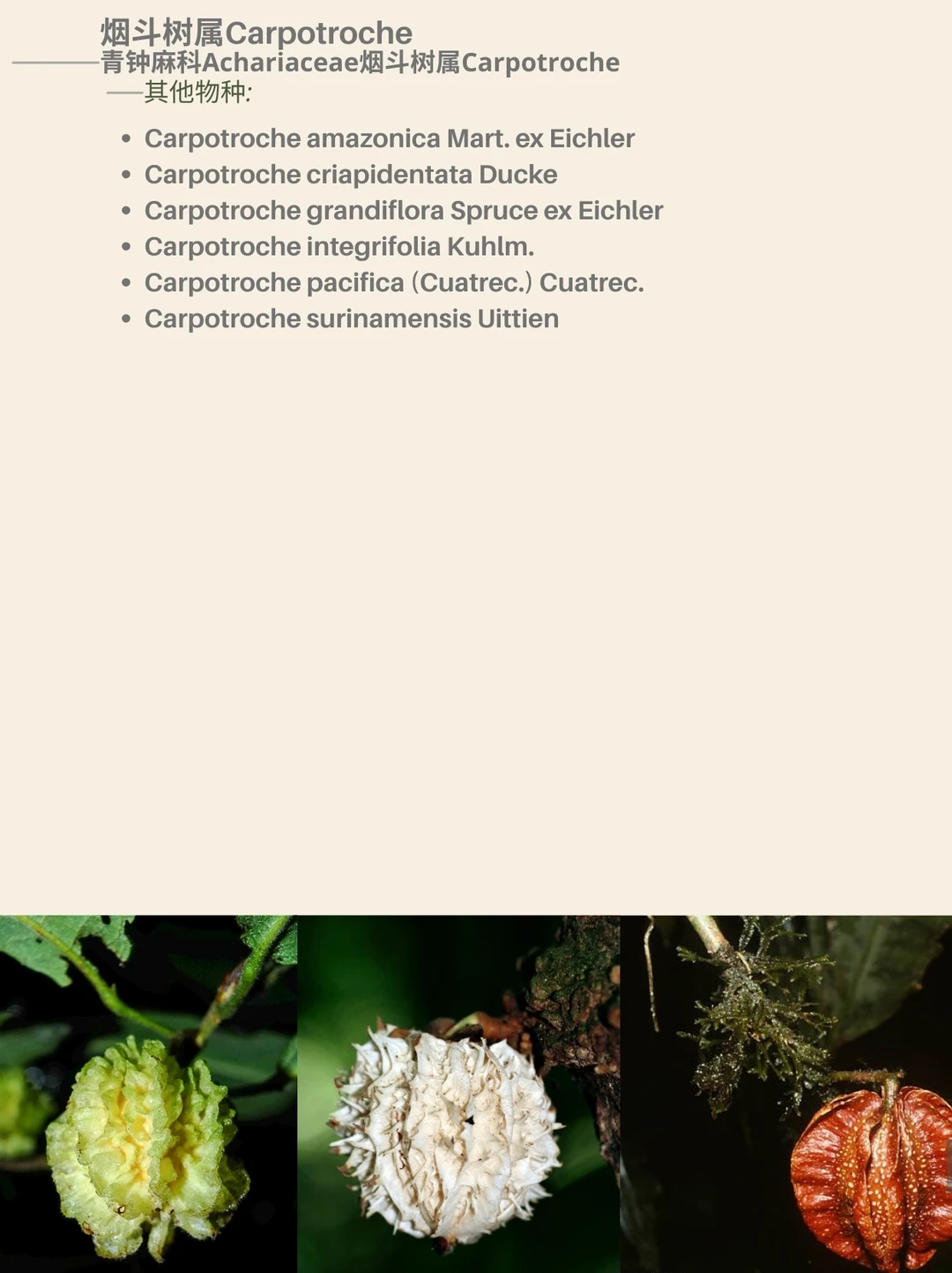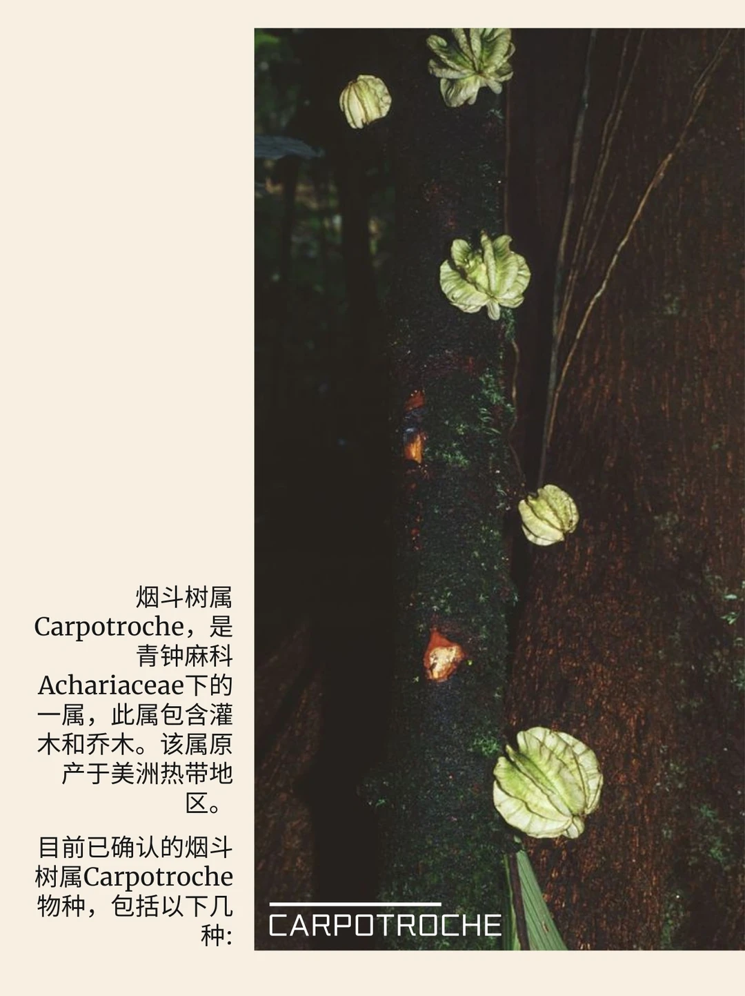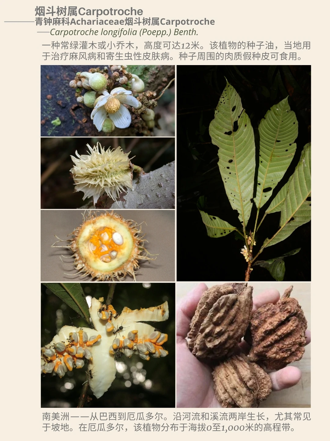 青钟麻科 烟斗树属 Carpotroche 灌木 乔木 美洲热带 水果 厄瓜多尔 热带植物 烟斗树属Carpotroche,是青钟麻科Achariaceae下的一属,此属包含灌木和乔木。该属原产于美洲热带地区。部分物种的果实或假种皮可以食用。