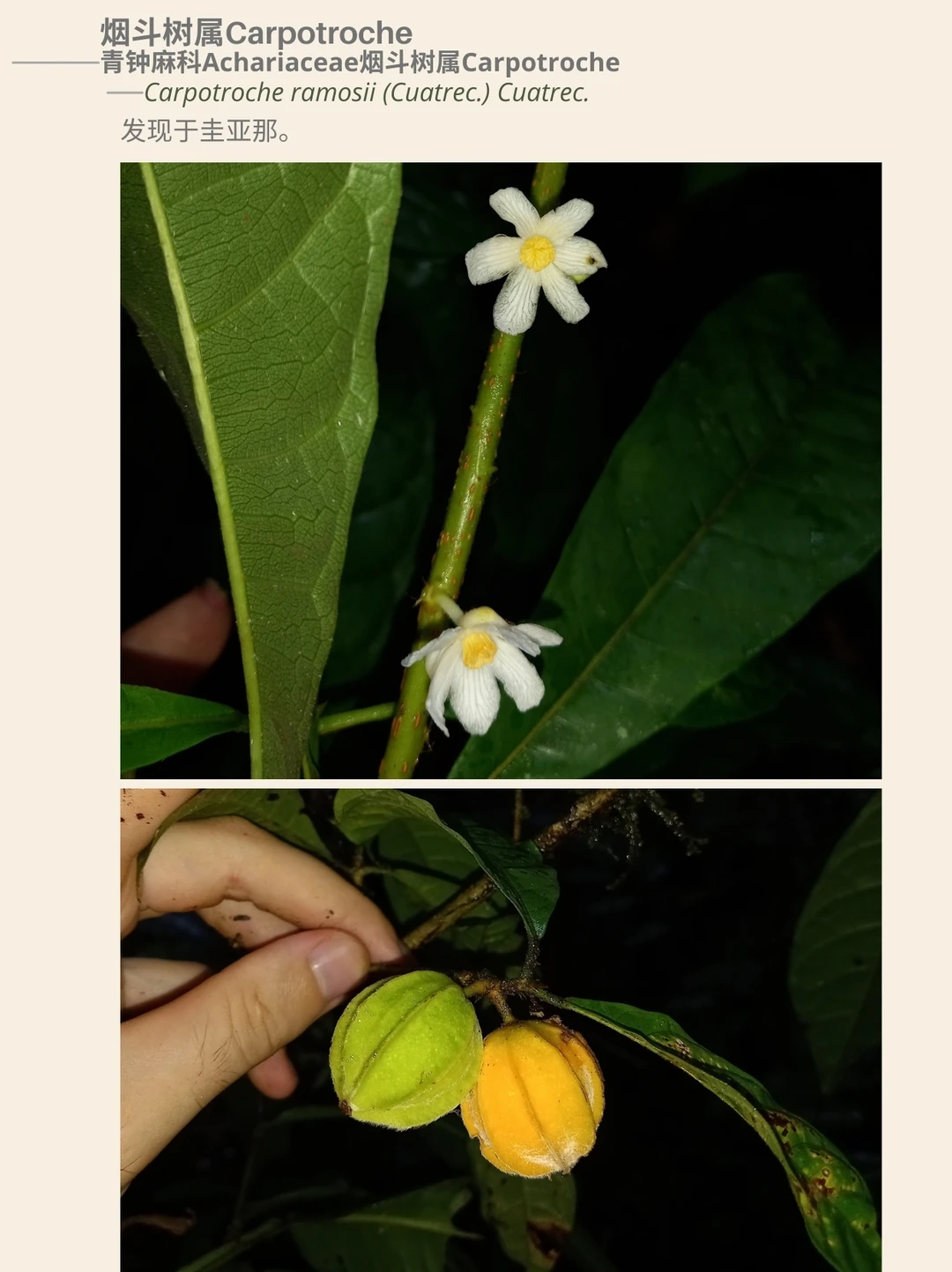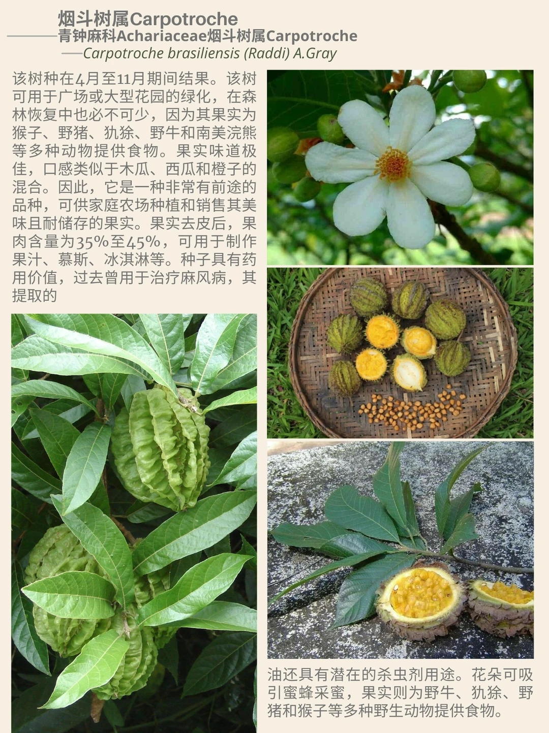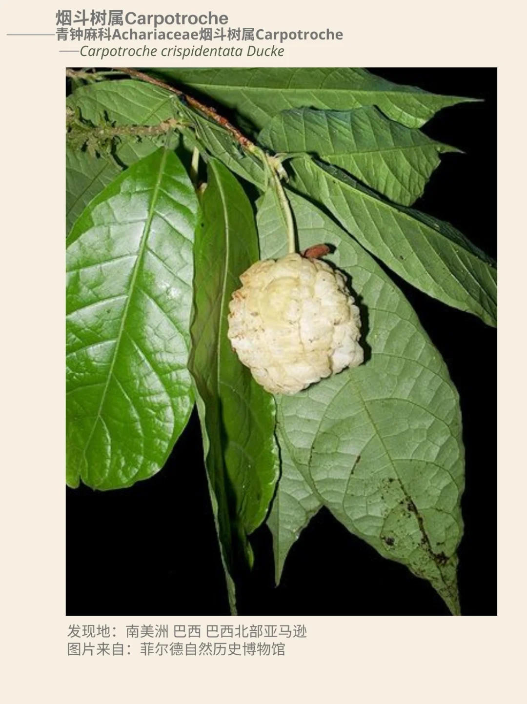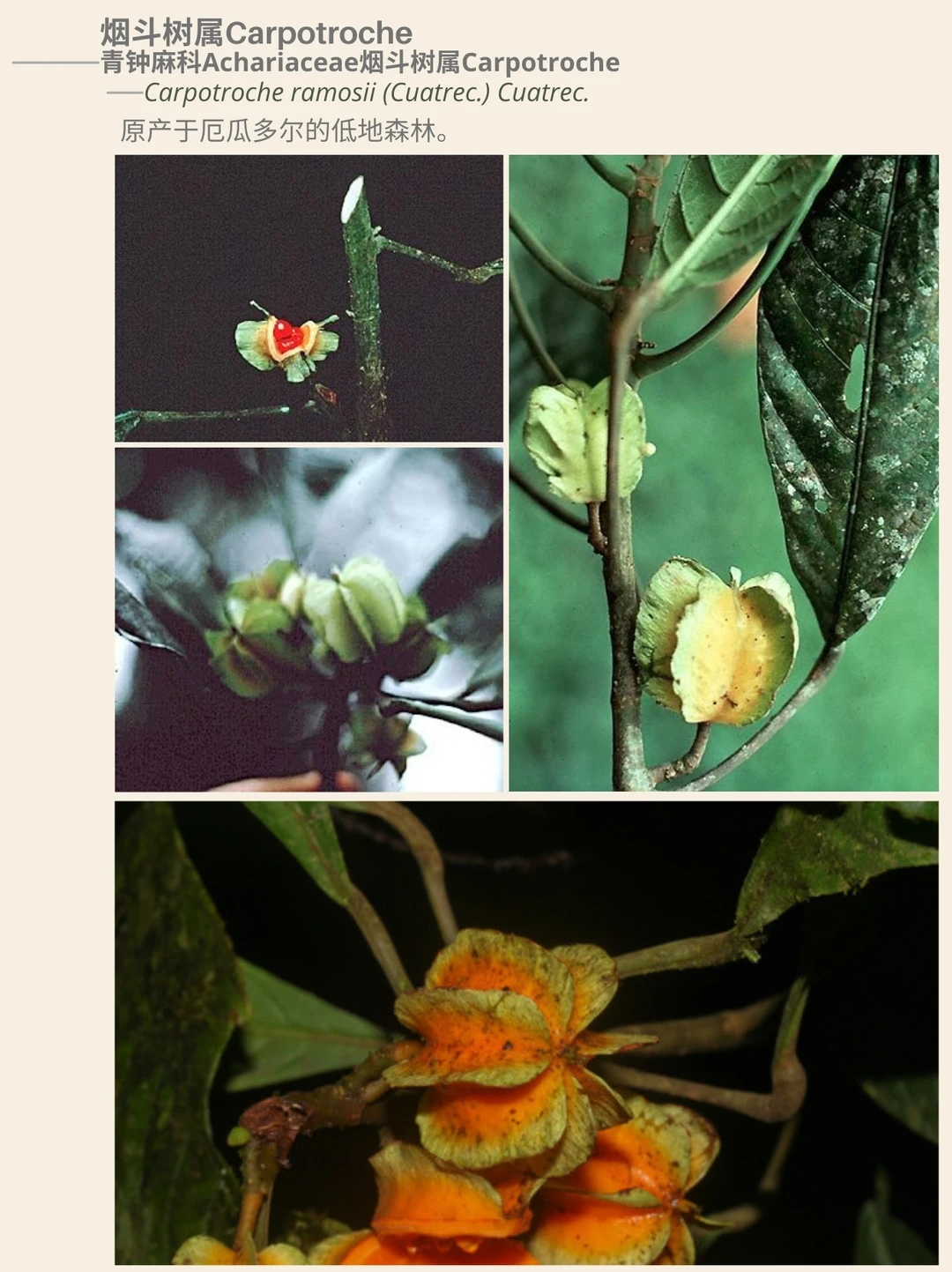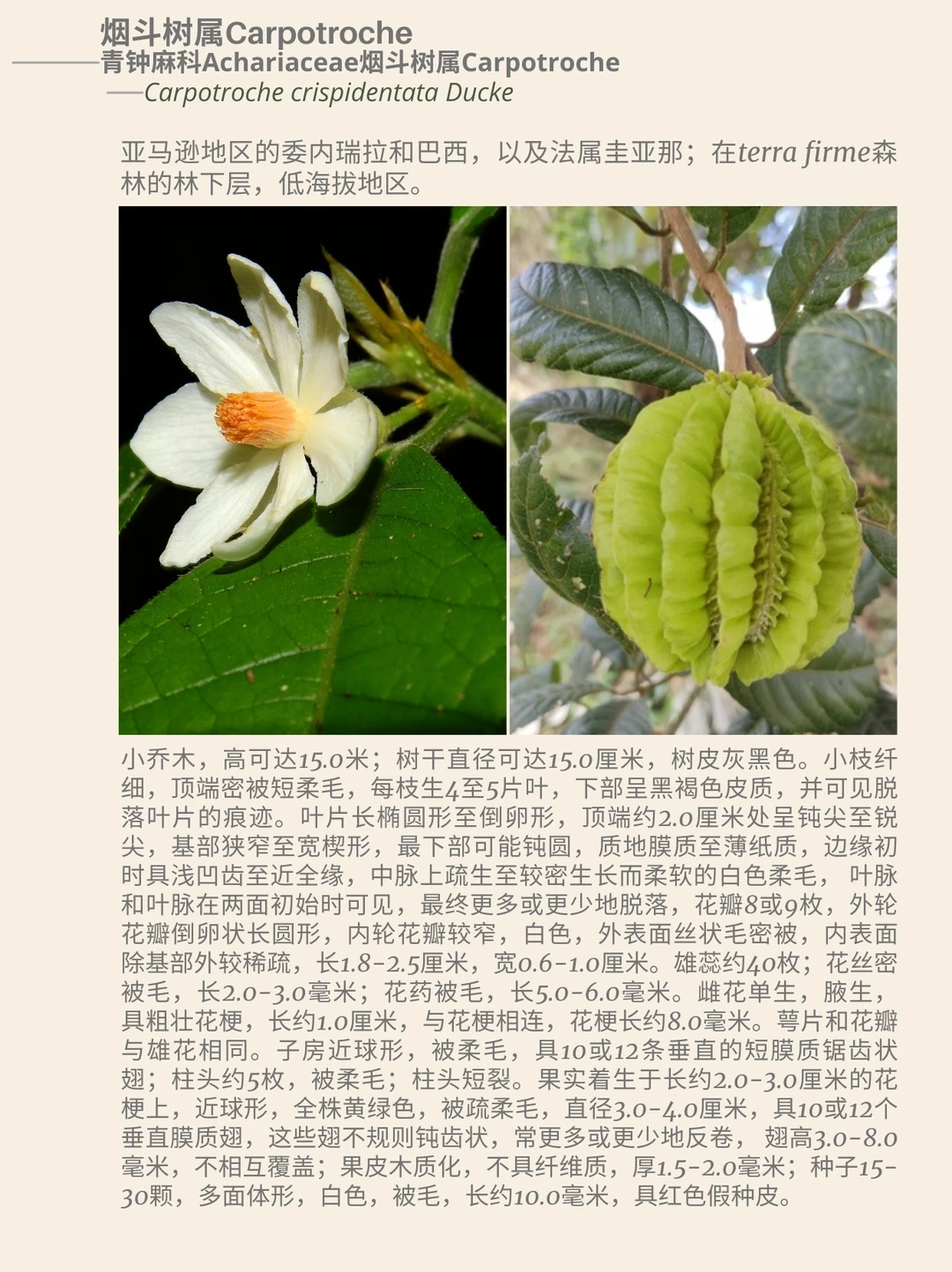 青钟麻科 烟斗树属 Carpotroche 灌木 乔木 美洲热带 水果 厄瓜多尔 热带植物 烟斗树属Carpotroche,是青钟麻科Achariaceae下的一属,此属包含灌木和乔木。该属原产于美洲热带地区。部分物种的果实或假种皮可以食用。