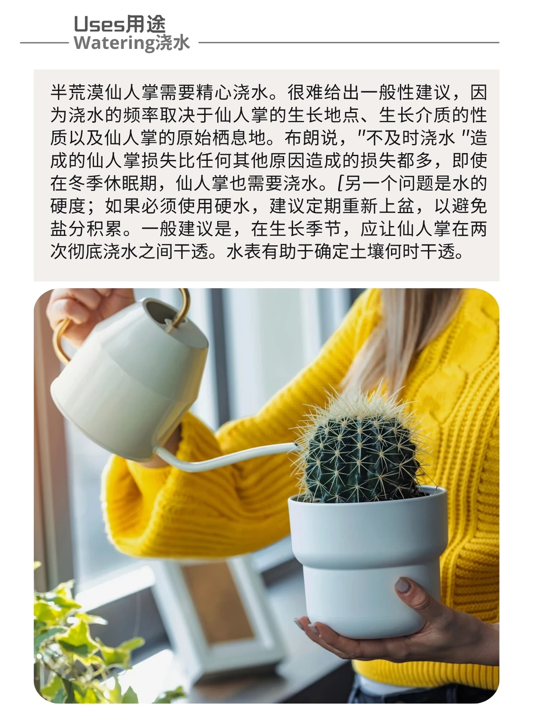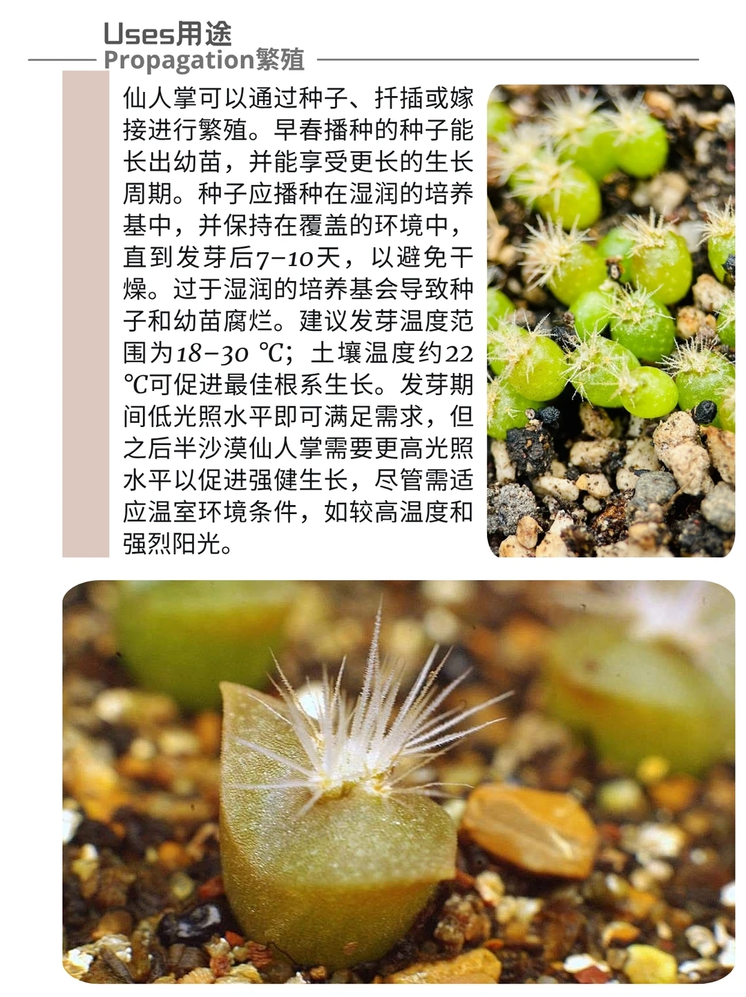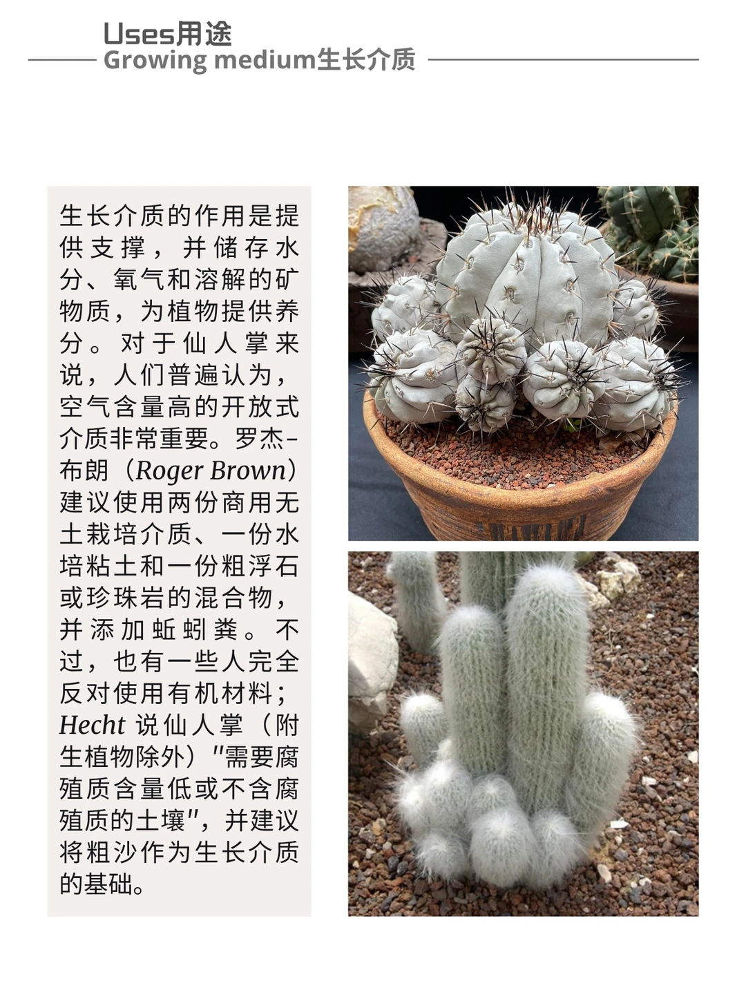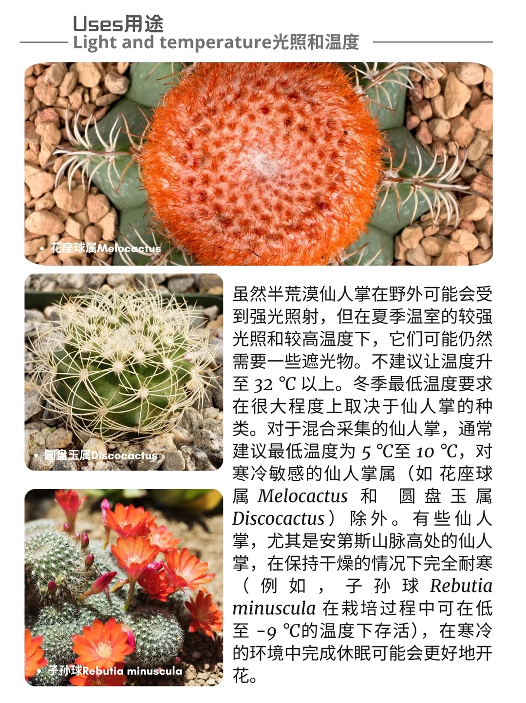 仙人掌科 \u00a0仙人掌栽培 \u00a0仙人掌繁殖 \u00a0仙人掌病虫害 仙人掌很受欢迎,因此有很多书籍专门介绍仙人掌的栽培。仙人掌自然生长在多种栖息地,然后在气候不同的许多国家种植,因此精确复制一个物种的正常生长条件通常并不现实。半荒漠仙人掌和附生仙人掌需要不同的条件,最好分开种植。关于附生仙人掌的栽培,请参阅 Schlumbergera(圣诞仙人掌或感恩节仙人掌)的栽培和附生杂交种的栽培。\n生长介质的作用是提供支撑,并储存水分、氧气和溶解的矿物质,为植物提供养分。对于仙人掌来说,人们普遍认为,空气含量高的开放式介质非常重要。罗杰-布朗(Roger Brown)建议使用两份商用无土栽培介质、一份水培粘土和一份粗浮石或珍珠岩的混合物,并添加蚯蚓粪。不过,也有一些人完全反对使用有机材料;Hecht 说仙人掌(附生植物除外)\"需要腐殖质含量低或不含腐殖质的土壤\",并建议将粗沙作为生长介质的基础。\n半荒漠仙人掌需要精心浇水。很难给出一般性建议,因为浇水的频率取决于仙人掌的生长地点、生长介质的性质以及仙人掌的原始栖息地。布朗说,\"不及时浇水 \"造成的仙人掌损失比任何其他原因造成的损失都多,即使在冬季休眠期,仙人掌也需要浇水。[另一个问题是水的硬度;如果必须使用硬水,建议定期重新上盆,以避免盐分积累。一般建议是,在生长季节,应让仙人掌在两次彻底浇水之间干透。水表有助于确定土壤何时干透。\n虽然半荒漠仙人掌在野外可能会受到强光照射,但在夏季温室的较强光照和较高温度下,它们可能仍然需要一些遮光物。不建议让温度升至 32 °C 以上。冬季最低温度要求在很大程度上取决于仙人掌的种类。对于混合采集的仙人掌,通常建议最低温度为 5 °C至 10 °C,对寒冷敏感的仙人掌属(如 Melocactus 和 Discocactus)除外。有些仙人掌,尤其是安第斯山脉高处的仙人掌,在保持干燥的情况下完全耐寒(例如,Rebutia minuscula 在栽培过程中可在低至 -9 °C的温度下存活),在寒冷的环境中可能会更好地开花。