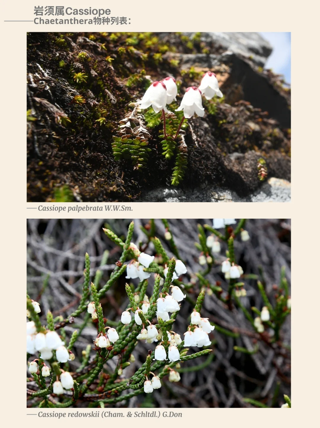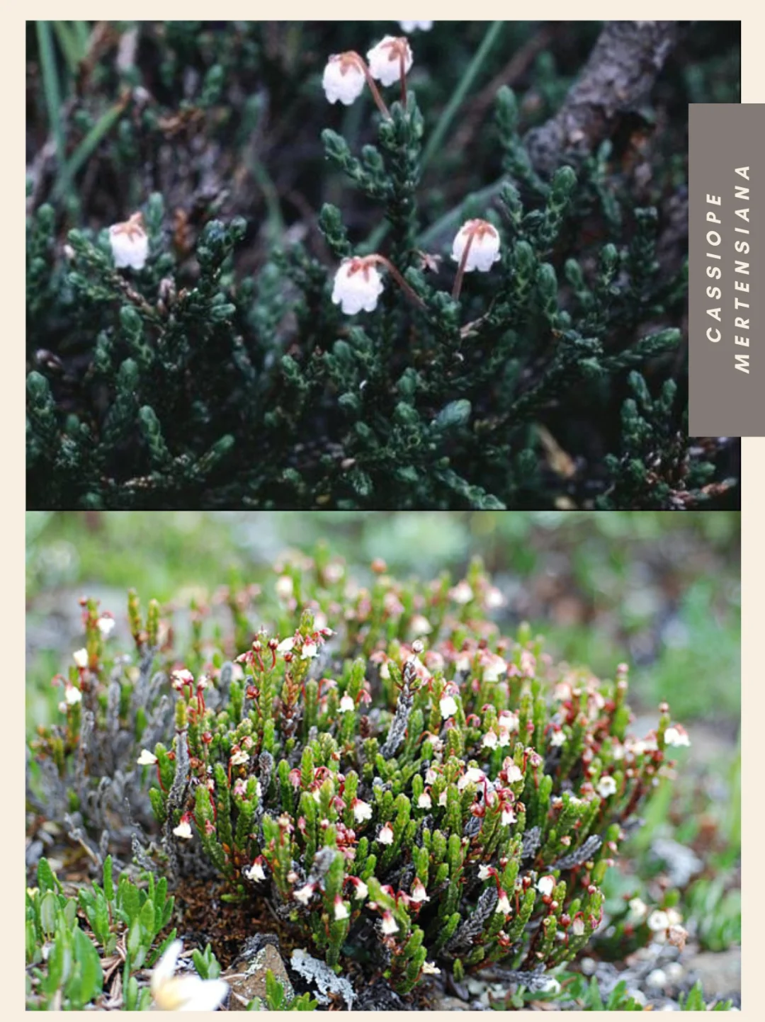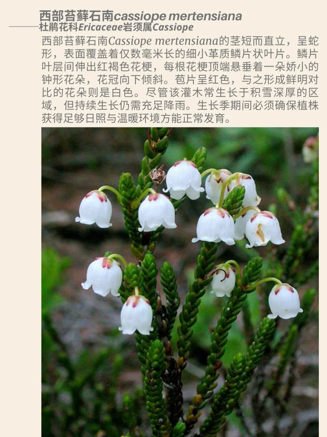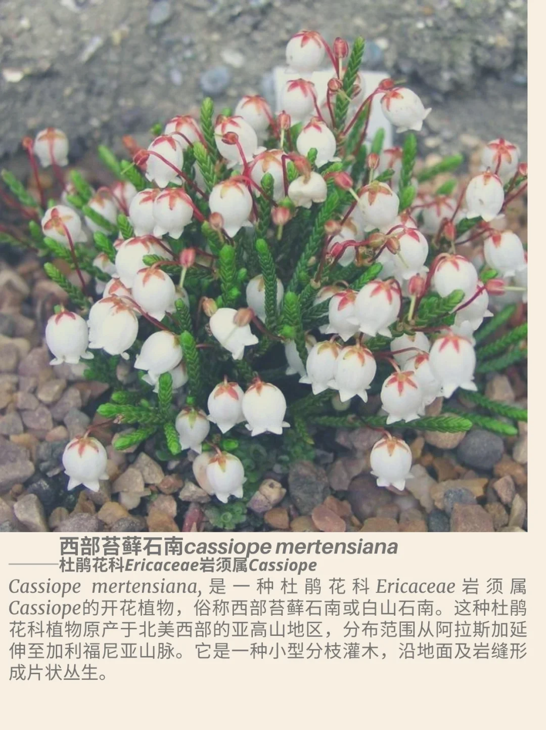 杜鹃花科 岩须属 Cassiope 西部苔藓石南 北美西部 阿拉斯加 加利福尼亚 杜鹃花 山野草 西部苔藓石南Cassiope mertensiana,是一种杜鹃花科Ericaceae岩须属Cassiope的开花植物,俗称西部苔藓石南或白山石南。这种杜鹃花原产于北美西部的亚高山地区,分布范围从阿拉斯加延伸至加利福尼亚山脉。它是一种小型分枝灌木,沿地面及岩缝形成片状丛生。