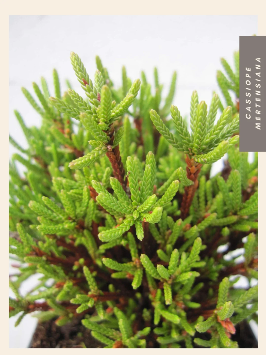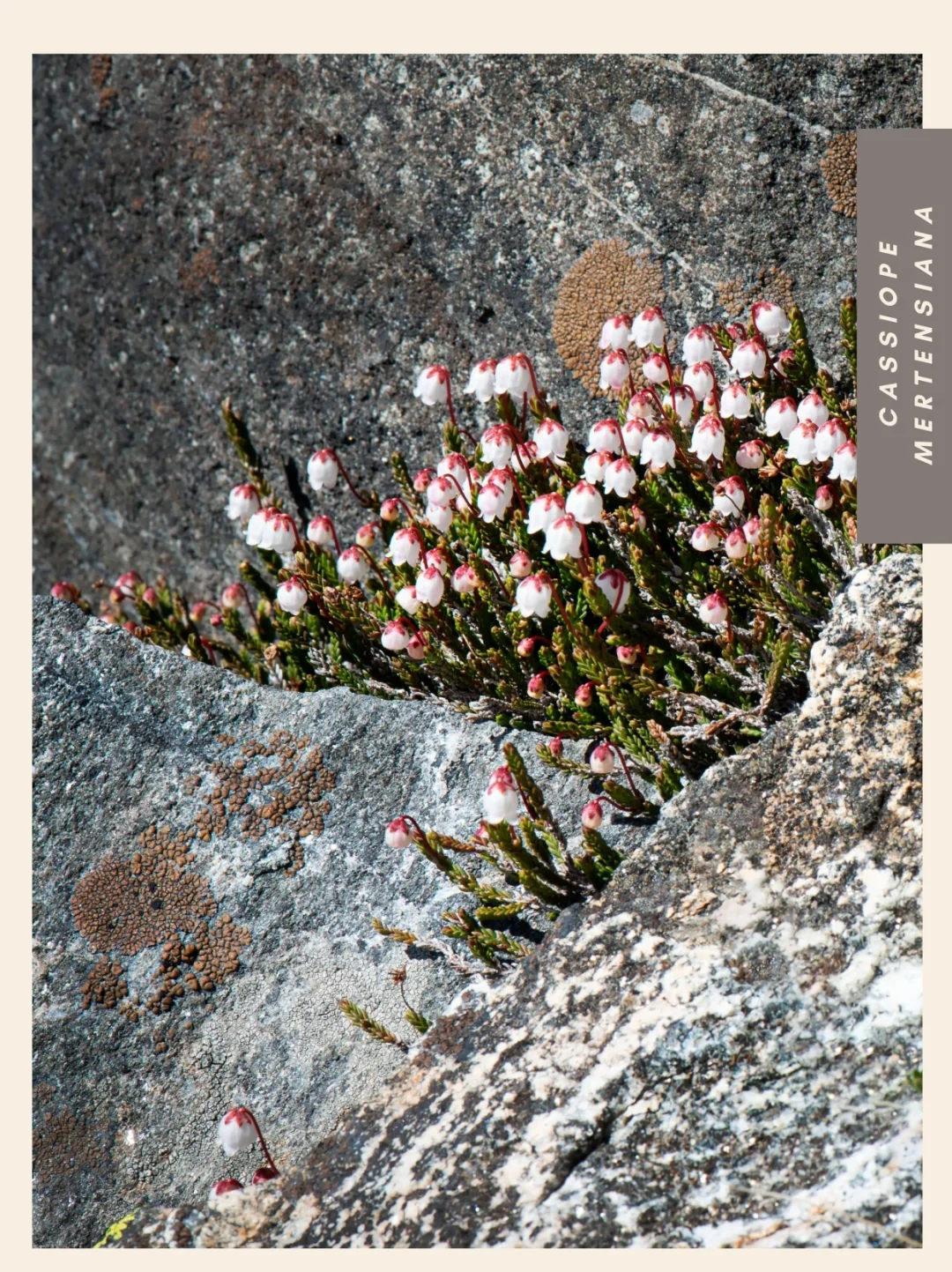 西部苔藓石南Cassiope mertensiana的茎短而直立,呈蛇形,表面覆盖着仅数毫米长的细小革质鳞片状叶片。鳞片叶层间伸出红褐色花梗,每根花梗顶端悬垂着一朵娇小的钟形花朵,花冠向下倾斜。苞片呈红色,与之形成鲜明对比的花朵则是白色。尽管该灌木常生长于积雪深厚的区域,但持续生长仍需充足降雨。生长季期间必须确保植株获得足够日照与温暖环境方能正常发育。