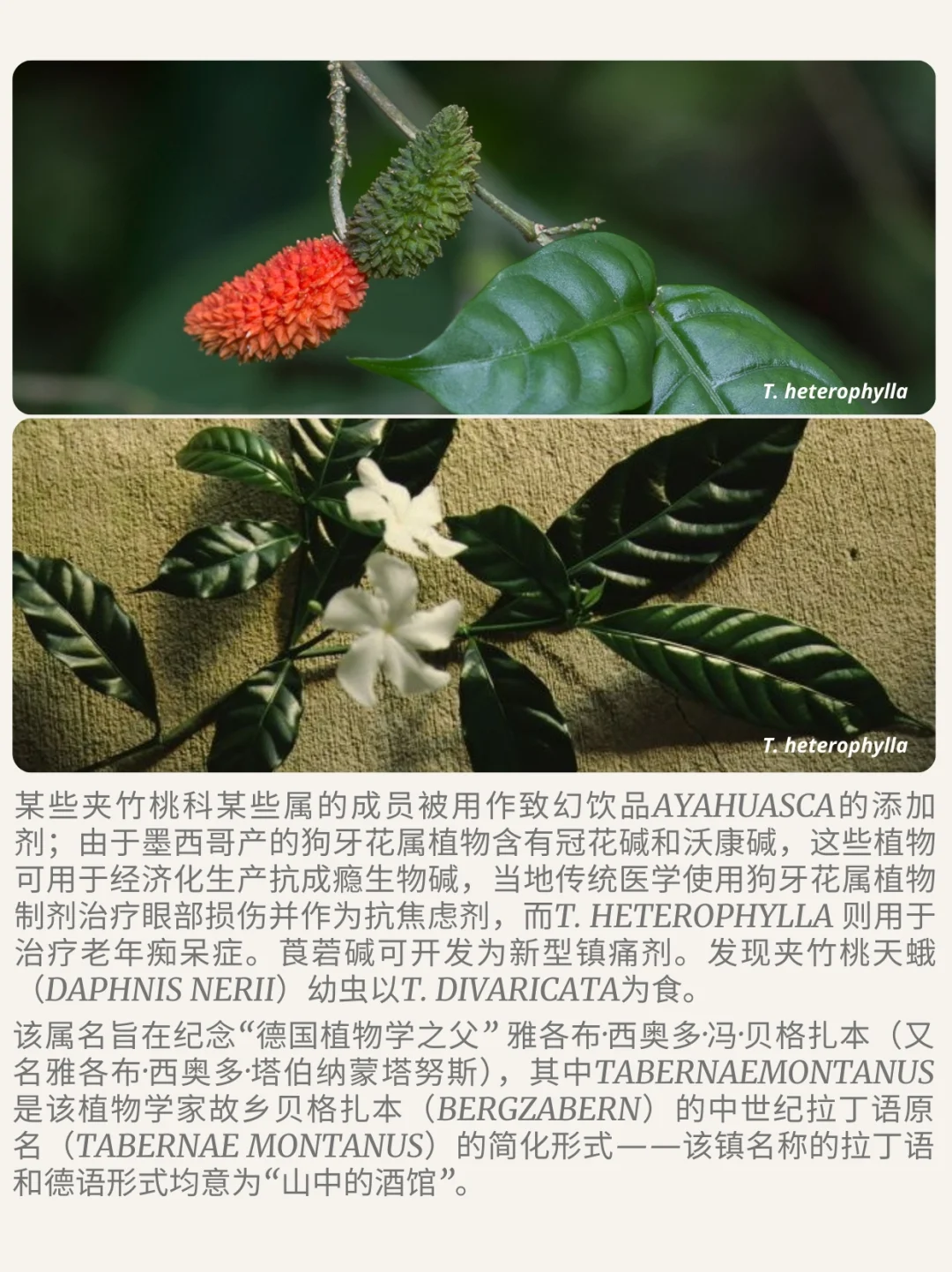 某些夹竹桃科某些属的成员被用作致幻饮品ayahuasca的添加剂;由于墨西哥产的狗牙花属植物含有冠花碱和沃康碱,这些植物可用于经济化生产抗成瘾生物碱,当地传统医学使用狗牙花属植物制剂治疗眼部损伤并作为抗焦虑剂,而T. heterophylla 则用于治疗老年痴呆症。莨菪碱可开发为新型镇痛剂。发现夹竹桃天蛾(Daphnis nerii)幼虫以T. divaricata为食。