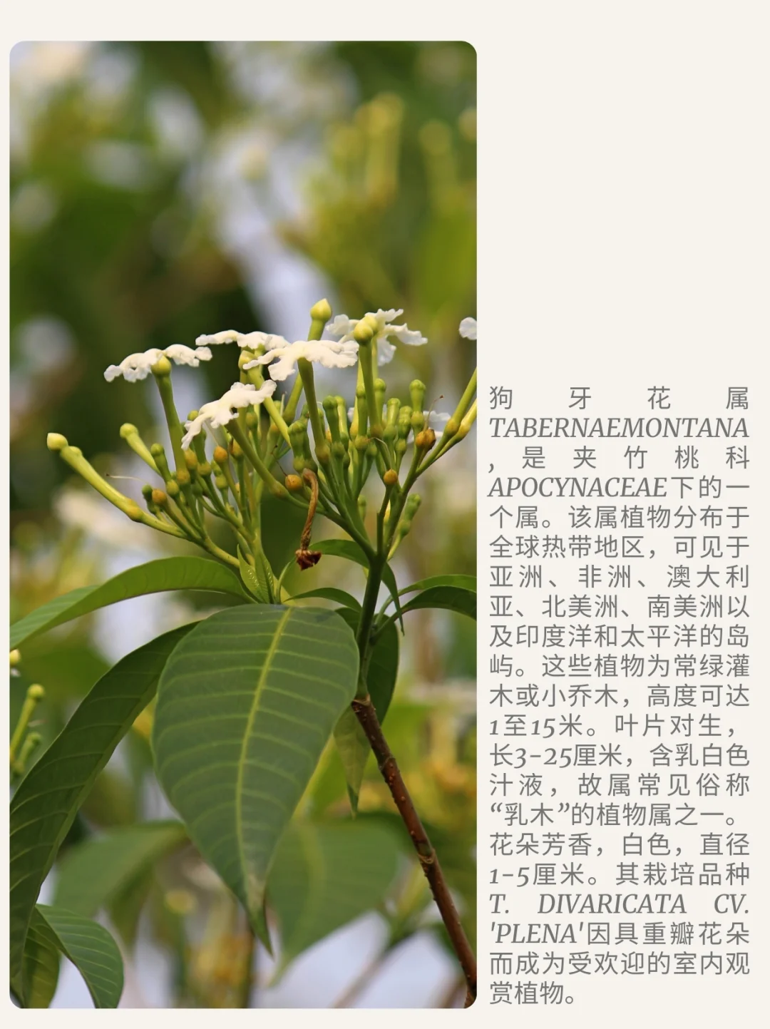 夹竹桃科 狗牙花属 Tabernaemontana 热带地区 常绿灌木 小乔木乳木 狗牙花属Tabernaemontana,是夹竹桃科Apocynaceae下的一个属。该属植物分布于全球热带地区,可见于亚洲、非洲、澳大利亚、北美洲、南美洲以及印度洋和太平洋的岛屿。这些植物为常绿灌木或小乔木,高度可达1至15米。叶片对生,长3-25厘米,含乳白色汁液,故属常见俗称“乳木”的植物属之一。花朵芳香,白色,直径1-5厘米。其栽培品种T. divaricata cv. 'Plena'因具重瓣花朵而成为受欢迎的室内观赏植物。