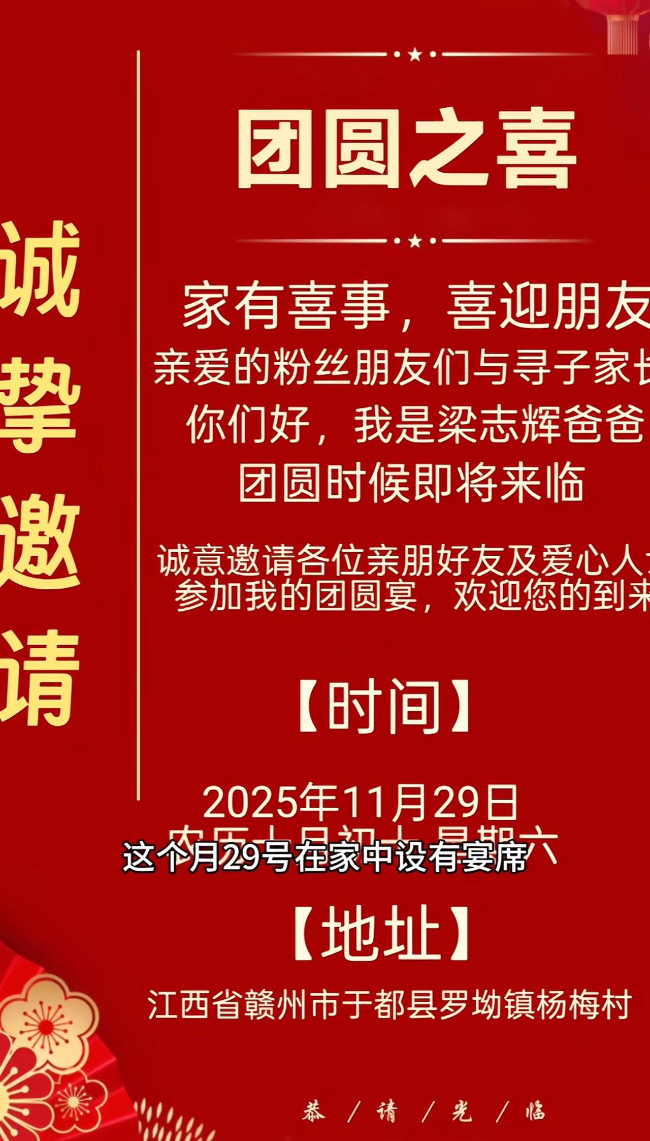 11月24日,寻子30年终获团圆的梁三寿在社交平台上发布了一封邀请函——他将于29日在江西赣州老家与儿子梁志辉相见。这距离他发布寻子成功消息,刚过去不到一个月。消息一出,众多网友在评论区送上祝福,并纷纷表示希望到场见证这场迟来的团圆,梁爸一一欢迎,还应网友呼吁,邀请了小米奇的父亲杜小华、党博爸爸等寻亲家长一同参与。