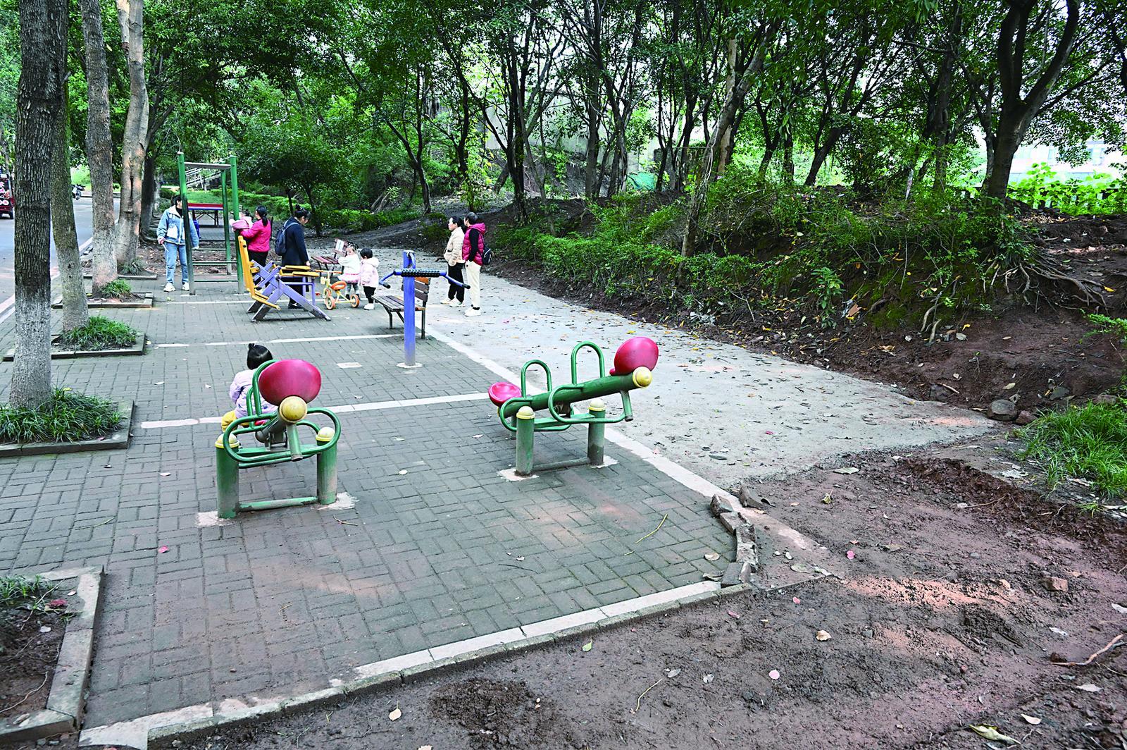 昨日上午,记者根据小区居民的指点,来到曦园柳镇小区三期79栋住宅楼下,目前已停工的电动摩托车充电桩安装场地。这里地处小区外围的一侧,本来是小区的公共绿地,另外还有两个场地比较狭窄的乒乓球场和休闲游乐场,是小区里难得的几个居民活动场地之一。