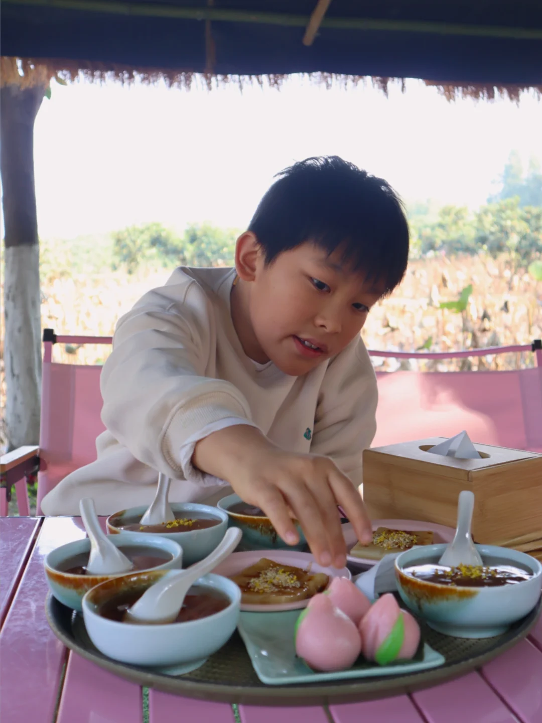 除了主食餐厅,村里小吃就根本吃不过来,桃园糖水铺,藕粉、年糕,桃胶,不爱吃甜食,就去磨坊,面食、豆浆、豆花,馄饨。