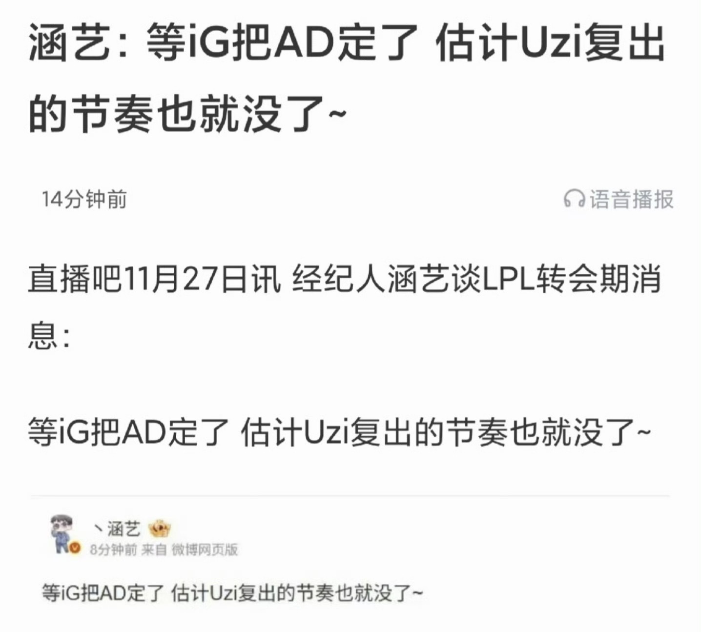Uzi超话出现爆料,在聊天群中有自称负责WE场馆灯光的群友表示uzi昨天已签合同