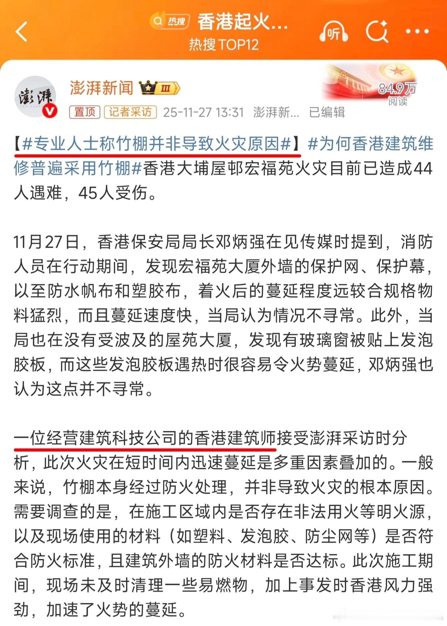 香港居民楼发生火灾之后有很多当地网友为竹子发声,纷纷声称搭建竹棚并非火灾原因,更令人无语的是竟然还有人拿烧制竹筒饭和烧铁烫竹小实验来举反例,简直太离谱了!我大概能理解把竹筒饭搬出来的这位网友的论证逻辑:竹子里的米饭都能烧熟,竹子都没烧起来,此事证明竹子足够防火。我就问你知不知道竹筒饭是要加水的?纸火锅不燃烧能证明纸也防火吗?汽化吸收热量无法达到燃点这都不明白?而且竹筒饭用的基本都是含水量高的新鲜竹子,这和搭建竹棚用的干燥竹子能一样吗?大家注意看这位网友的引证照片,这下面烧的不就有竹子吗?再说烧铁烫竹,烧铁此时接触的仅仅只是竹子的一个切面,切面接触烧铁后便会碳化,上面的碳化层有效阻止了烧铁下落,下面的竹子便会安然无恙。相同原理的小实验还有烧铁烫木头,木头同样仅仅只是接触面碳化,也没有当场燃烧,这能证明木头也防火吗?有些媒体采访香港专业人士讲竹棚并非火灾原因,我一看所谓的专业人士竟然是当地建筑科技公司建筑师,这不纯纯利益相关吗?实际情况是竹子绝对属于可燃物,你用打火机去点的确难以点燃,但碰到成规模的火情不仅能烧起来,而且还很耐烧,更关键的是竹子燃烧产生的热解气体会进一步加剧火势。这次香港居民楼火灾不管当地还是内地全都痛心疾首,各界人士有钱出钱有力出力,我们不仅要第一时间抢救生命,帮助受灾群众度过难关,更要吸取教训防微杜渐。咱们说回搭建竹棚,并不是说别人都不用只有你在用,就能说明你这东西是好的。保证安全永远是建筑行业的第一顺位,只要违背安全原则,一切协会意见均可视为利益相关。历史经验无数次地告诉我们:越是在重大灾难面前,越是要实事求是,越是要尊重科学。最后为遇难的香港同胞默哀,祈祷奇迹发生能再从失联者里面多救一些人出来。香港火灾已有75人遇难魔金石科技