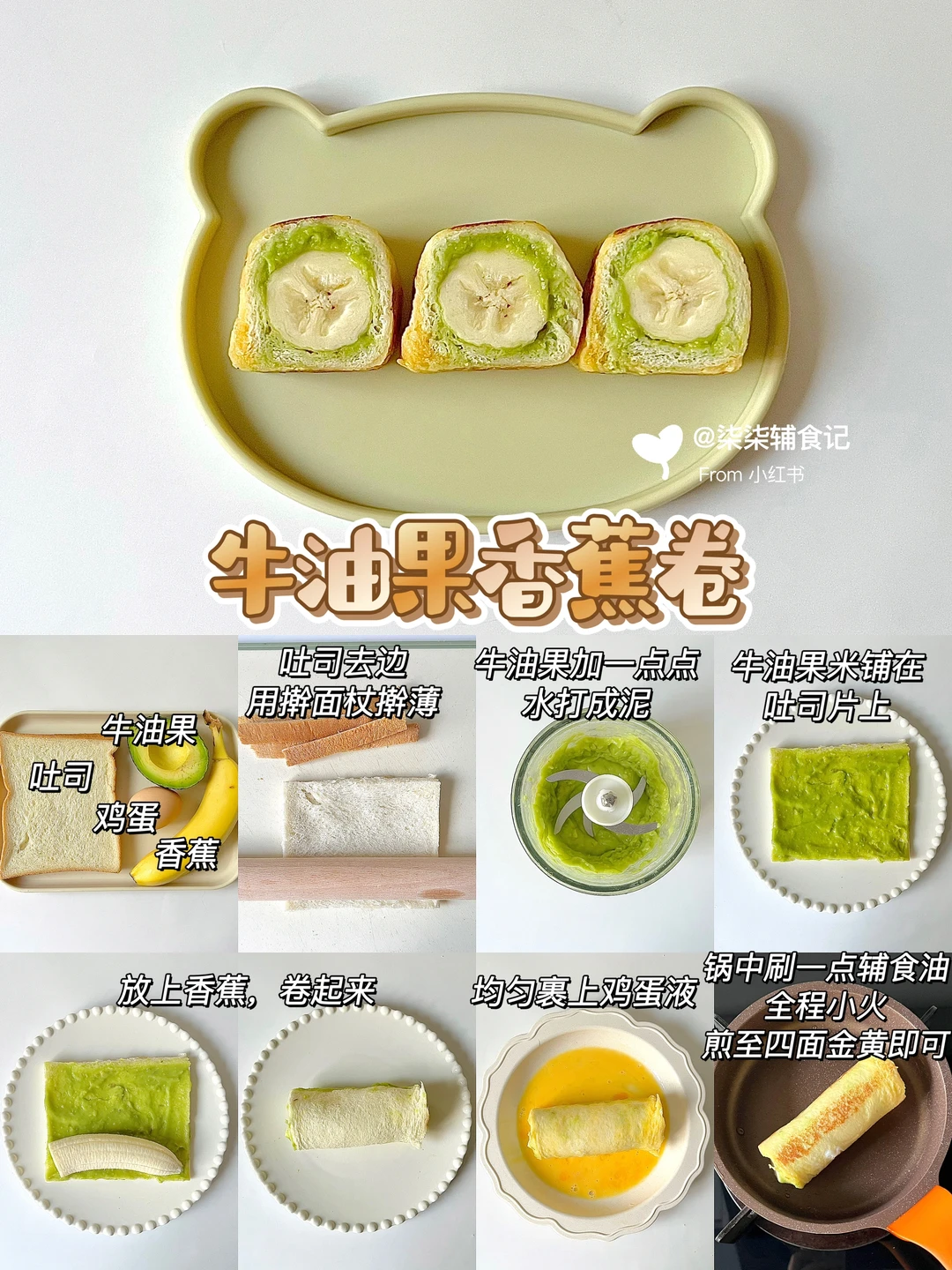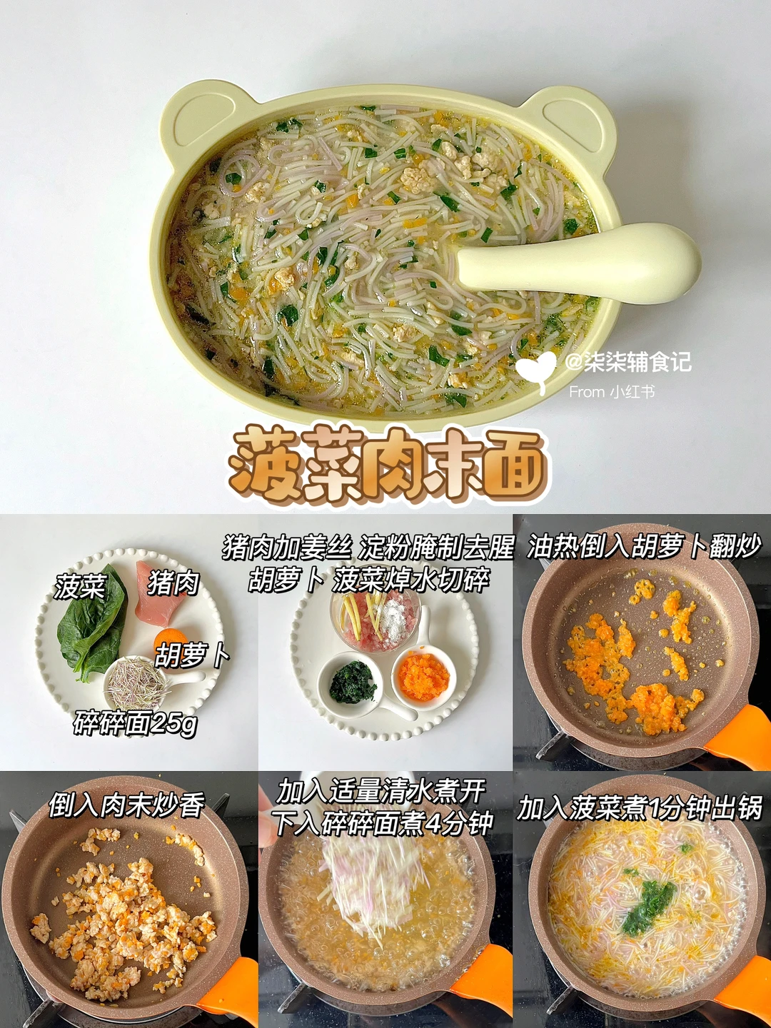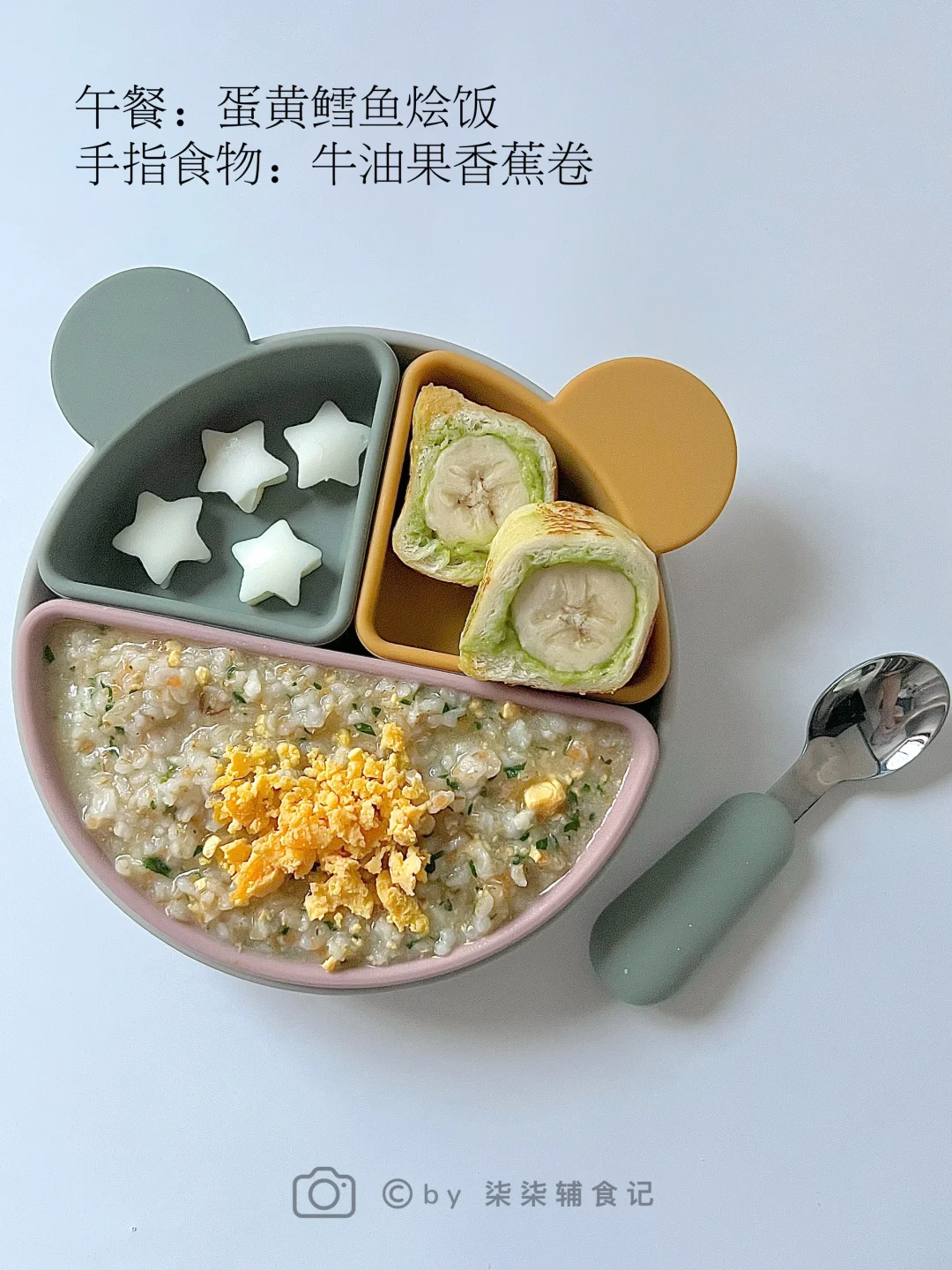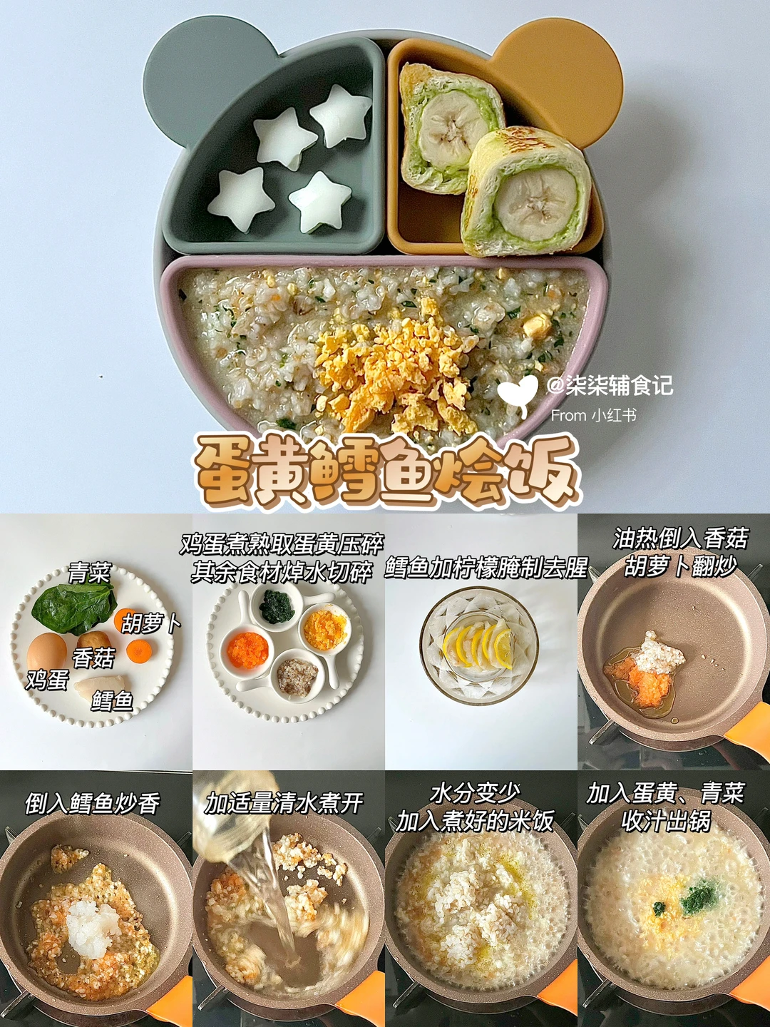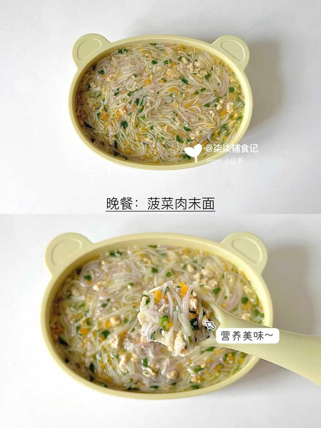 👧:11个月➕22天 🥛8:00:奶 210ml 🍛午餐:11:00 蛋黄鳕鱼烩饭➕牛油果香蕉卷 🥛2:30: 奶 160ml 🍲晚餐:18:00 菠菜肉末面➕奶香南瓜松饼 🥛睡前:21:30 奶210ml-240ml 💡:教程都在上面图中啦! 👩🍳:宝宝的食材大小和分量根据宝宝的咀嚼能力和消化能力调整哦~