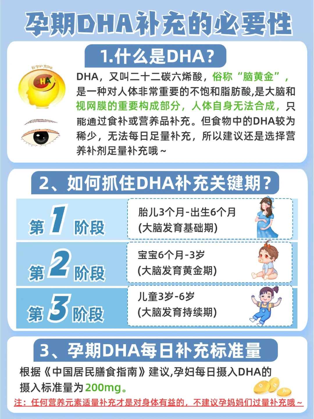 孕妈每天摄入DHA的标准是200mg/天,不建议过量补充。